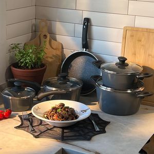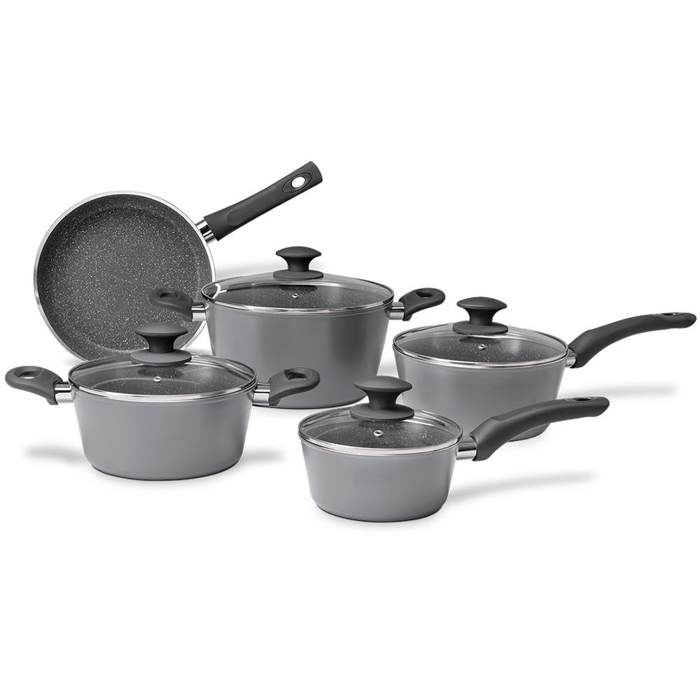 Conteúdo: 5 peças, caçarola com tampa 24x13cm 4,6L, caçarola com tampa 20x9,5cm 2,1L, panela com tampa 20x9,5cm 2,1L, panela com tampa 16x7,5cm 1L e frigideira Ø 24x5cm 1,8L