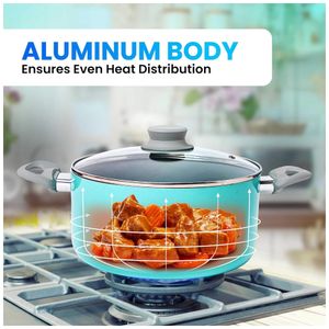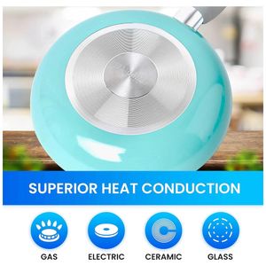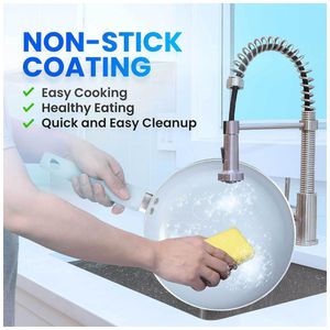 Distribuição uniforme de calor A construção em alumínio premium das frigideiras e panelas proporcionará resultados de cozimento consistentes. O calor é conduzido e distribuído de forma rápida, mas uniforme, economizando tempo de cozimento e necessidades de energia, já que apenas é necessário calor baixo a médio. O revestimento premium evita a ferrugem e facilita a limpeza. Também inclui alças confortáveis e fáceis de segurar que permanecem frias durante o cozimento.