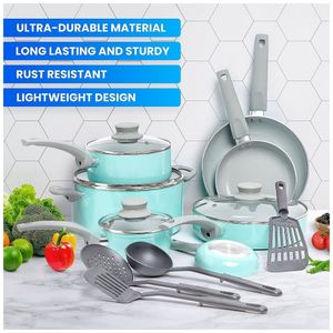 Sofisticado e prático Se você é um chef orgulhoso que gosta de exibir suas panelas e frigideiras, este lindo conjunto de panelas é para você. Com uma paleta de cores contemporânea que irá revigorar e aumentar a criatividade na cozinha, o conjunto de 16 peças oferece tudo o que você precisa para cozinhar no dia a dia ou para apresentar um banquete do fogão à mesa. Os utensílios de cozinha não são apenas deliciosos de cozinhar, mas suas características de qualidade os diferenciam em praticidade e durabilidade.