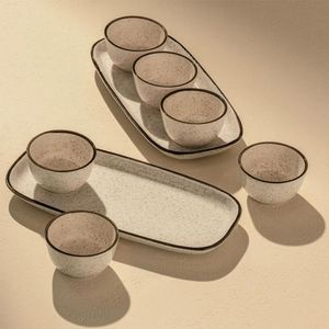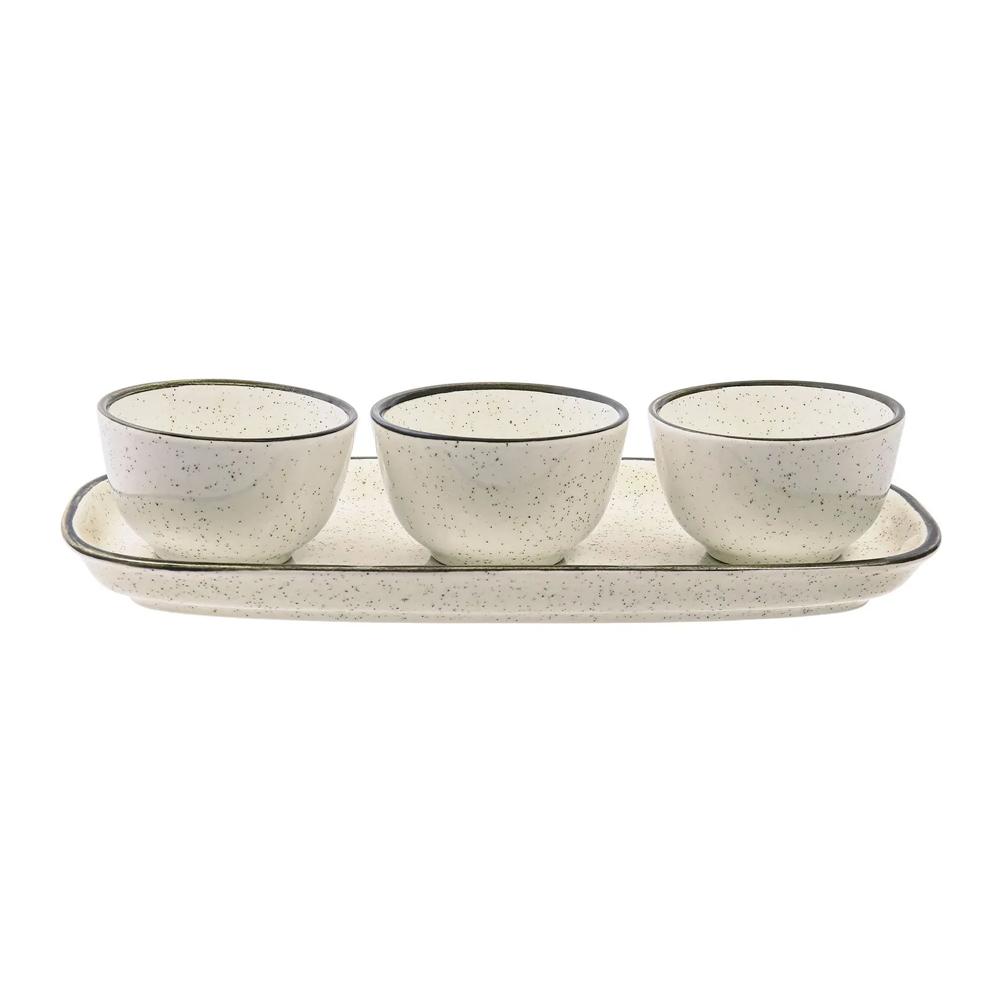 O conjunto é composto por uma travessa retangular (que serve como apoio e facilita o transporte) e três tigelas redondas (ideais para molhos, patês e acompanhamentos).