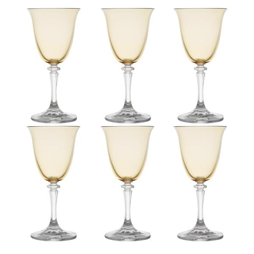 O jogo de taças de cristal âmbar Kleopatra da Bohemia possui 6 belas taças de vinho de 250ml. Com seu formato único, notável e feito sob medida, é ideal para degustar o vinho de sua preferência.