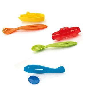 O jogo de talheres todo em plástico (colher, garfo e faca) transforma-se num encantador jogo para jogar na cadeira alta: cada peça esconde um divertido meio de transporte - a faca um divertido avião, o garfo um navio e a colher um carrinho, todos itens que estimulam a imaginação das crianças. O jogo é destinado a crianças a partir de 10 meses. Todos os componentes do jogo são feitos de plástico, Livres de BPA e são adequados para lavar em uma máquina de lavar louça.