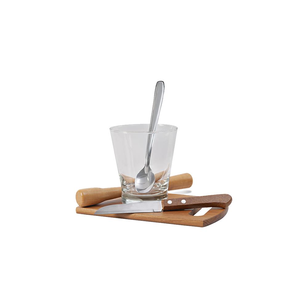 Todo bom brasileiro adora uma caipirinha e vai amar este conjunto da linha Lyon. O kit foi especialmente desenvolvido para o preparo do drink mais tropical do Brasil. A tábua de madeira e a faca servem para picar as frutas, o pilão de madeira para amassá-las, o copo de vidro de 350ml para servir a caipirinha e a colher de inox para dar aquela misturadinha. Prático, resistente e charmoso, o conjunto pode lhe acompanhar em viagens de férias ou almoços de família. Todas as peças podem ir à lava-louça.