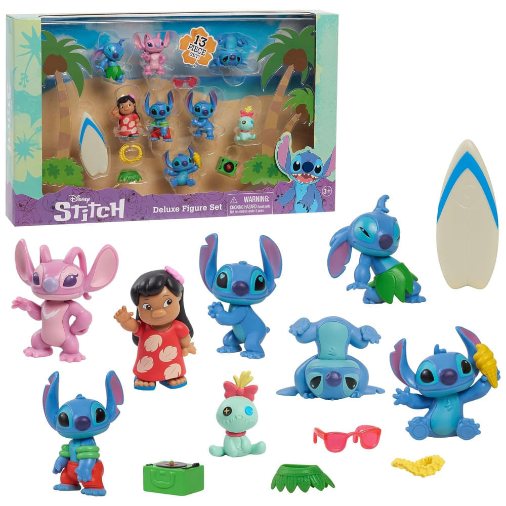 O conjunto inclui Stitch em quatro looks diferentes, Lilo, Scrump, Angel e cinco acessórios para brincar. Cada figura tem aproximadamente 5 centímetros de altura e faz uma pose de ação dinâmica, permitindo que as crianças recriem suas cenas favoritas do filme ou inventem novas aventuras havaianas para este grupo travesso de amigos.
