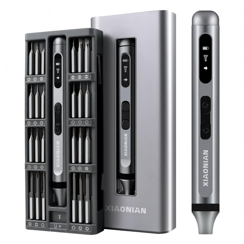 Atenção: Todos os produtos elétricos são 110V e necessitam de adaptador para a tomada no formato Brasileiro. Kit de chaves de fenda elétrico de precisão XIAONIAN com 52 peças, incluindo 48 bits S2 magnéticos para reparos em smartphones, relógios, óculos, PC, câmeras e laptops. Motor sem fio a 200 RPM com modos elétrico (0,3 N.m torque) e manual (3,5 N.m torque), luz LED sem sombra e bateria Li 350 mAh (45 min carga via USB-C) suporta até 900 parafusos por carga ou 180 min contínuos. Construção toda metálica em liga de alumínio com case transparente permite recarga sem remoção da ferramenta. Bits S2 em aço liga oferecem resistência à corrosão em formatos star, Phillips, pentalobe, Torx, hex, slotted, triangle e square. Design ergonômico tipo caneta com grip antiderrapante e mecanismo pop-up magnético facilita troca rápida de bits e acesso organizado. Botão forward/reverse simplifica operação bidirecional; zona de magnetização ajusta intensidade para componentes sensíveis. Compatível com tablets, celulares, smartwatches, drones e eletrônicos compactos com parafusos de precisão variados. Cuidados: Use apenas USB-A para USB-C (sem PD); carregue completamente antes do primeiro uso; evite quedas na construção metálica. Ficha Técnica • Dimensões do produto: 17 x 6,4 x 1,5 cm? • Peso do produto: 0,25 kg (estimado para construção compacta metálica)? • Peso do pacote: Não especificado (tipicamente 0,4 kg com case)? • Potência: 3,7 V DC, 200 RPM, torque 0,3 N.m elétrico + 3,5 N.m manual? • Capacidade: 52 peças (48 bits S2 + 1 chave elétrica + acessórios)? • Materiais: Aço S2 nos bits, liga alumínio no corpo/case? • Fonte de alimentação: Bateria Li 350 mAh USB-C (45 min carga, 90 dias standby)? • Faixa etária: Adultos (uso técnico/portátil)? • Conteúdo da caixa: 48 bits S2 magnéticos, 1 chave elétrica 3,7V com LED, 1 cabo USB-C, 1 organizador componentes, 1 pinça, 1 crowbar, 1 case liga transparente, manual? • Manual do usuário: Chinês/Inglês (padrão XIAONIAN)
