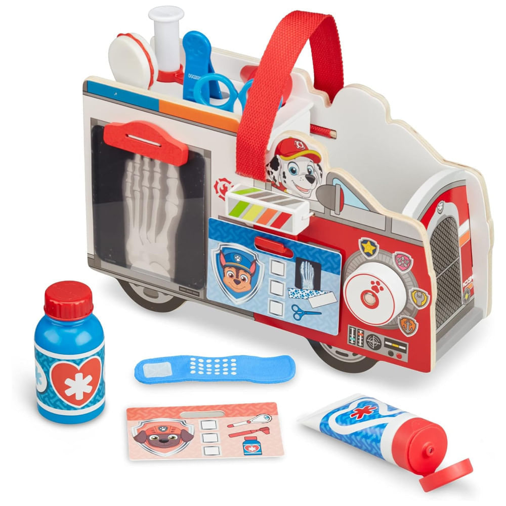 Atenção: Todos os produtos elétricos são 110V e necessitam de adaptador para a tomada no formato Brasileiro. O transportador de madeira em forma de caminhão de resgate Marshalls PAW Patrol é um conjunto de primeiros socorros com 14 peças essenciais para qualquer missão de resgate. Com um cartão de missão preso na lateral do transportador, as crianças podem virar o bloco para mostrar o nível de emergência e girar o botão para escolher o crachá de um filhote para ajudar. As ferramentas EMT incluem um termômetro rolante, uma seringa, um frasco de remédio, bandagens, pinças, tesouras e um tubo de pomada.