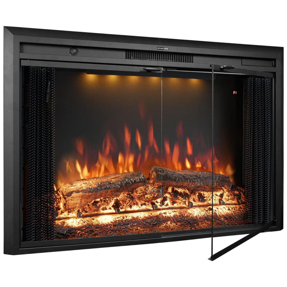 A lareira elétrica combina um design atraente com portas de vidro duplo, tela de malha móvel e um metal preto resistente, mantendo uma aparência tradicional. Seu interior é revestido com tijolos em ambos os lados e inclui um tronco falso, tornando-a ideal para suportes de TV, estantes, paredes de lareira e aparadores.