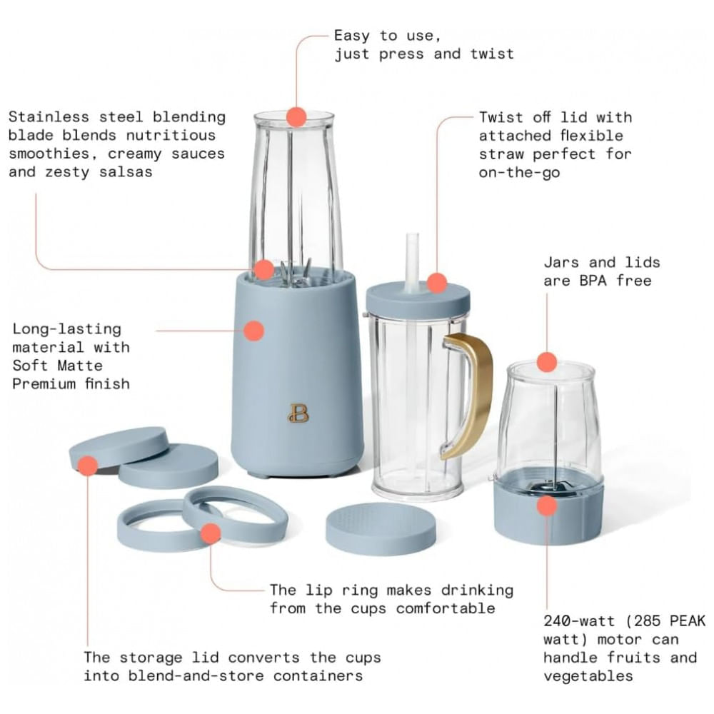 Atenção: Todos os produtos elétricos são 110V e necessitam de adaptador para a tomada no formato Brasileiro. Liquidificador pessoal compacto de 240W da linha Beautiful by Drew Barrymore, com acabamento branco fosco e sistema de copos para preparo direto e consumo imediato de bebidas e receitas em pequenas porções. Utiliza conjunto de lâminas em aço inox para mistura e trituração, indicado para smoothies individuais, pequenos molhos, preparo de alimentos em porções reduzidas e moagem de café e temperos secos. ? O kit inclui base com motor, copos de diferentes capacidades, tampa de viagem com alça e canudo com sistema anti-pingos, além de tampas para armazenamento e anéis de acabamento para beber diretamente no copo. Os recipientes são produzidos em material livre de BPA, compatíveis com lava-louças na prateleira superior, enquanto a base é acionada por giro, facilitando o uso em bancadas compactas. Ficha Técnica: Marca: Beautiful Coleção: Beautiful by Drew Barrymore Modelo: E19285 Tipo de produto: Liquidificador pessoal com conjunto de copos Cor: Azul fosco Acabamento: Soft-matte (fosco suave) Capacidade do copo de viagem: 473ml Capacidades adicionais: Copo intermediário aproximadamente 400ml e copo de moagem aproximadamente 180ml Potência: 240W Voltagem: 110V Tipo de acionamento: Sistema twist/operado por giro manual do copo na base Sistema de lâminas: Lâmina de mistura: Lâmina em aço inox para bebidas e preparos cremosos Lâmina de moagem: Lâmina em aço inox para moagem de grãos e especiarias ? Componentes (12 peças): Base do motor 240W Conjunto de lâmina de mistura Conjunto de lâmina de moagem Copo de viagem 473ml com alça Copo intermediário ~400ml Copo de moagem ~180ml Tampa de viagem com canudo anti-pingos Anéis de acabamento para beber no copo Tampas de armazenamento para copos Material dos copos: Plástico livre de BPA Material das lâminas: Aço inoxidável Material da base: Plástico com componentes metálicos internos Dimensões do produto: 11,6 cm (diâmetro) x 30,7 cm (altura) Peso do produto: 1,8kg Peso do pacote: 2,0kg Fonte de alimentação: Energia elétrica com cabo de alimentação Uso recomendado: Smoothies individuais, pequenos molhos, preparo de porções menores e moagem de café e especiarias Limpeza: Copos e tampas compatíveis com lava-louças (prateleira superior); base com limpeza externa por pano úmido Manual do usuário: Inglês