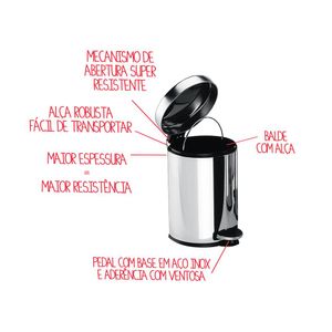 As lixeiras são objetos indispensáveis e muito utilizados em cozinhas, banheiros e áreas de serviço. Pensando nisso, a Brinox desenvolveu uma linha de lixeiras que, além de elegantes, são práticas e funcionais. O recipiente externo é feito em aço inox, um material resistente e não poroso, que evita o acúmulo de resíduos e facilita a limpeza. Além disso, o produto possui um balde interno removível em plástico. O pedal, localizado na parte inferior da lixeira, facilita a abertura e fechamento da peça e a alça exterior simplifica o seu transporte. O sistema de aderência por ventosas fixado na base garante a estabilidade e o manuseio da mesma. O produto está disponível em cinco diferentes tamanhos, que podem ser utilizados em diferentes ambientes da casa e para diferentes necessidades. Medidas: 3L (ø 17cmx27cm).