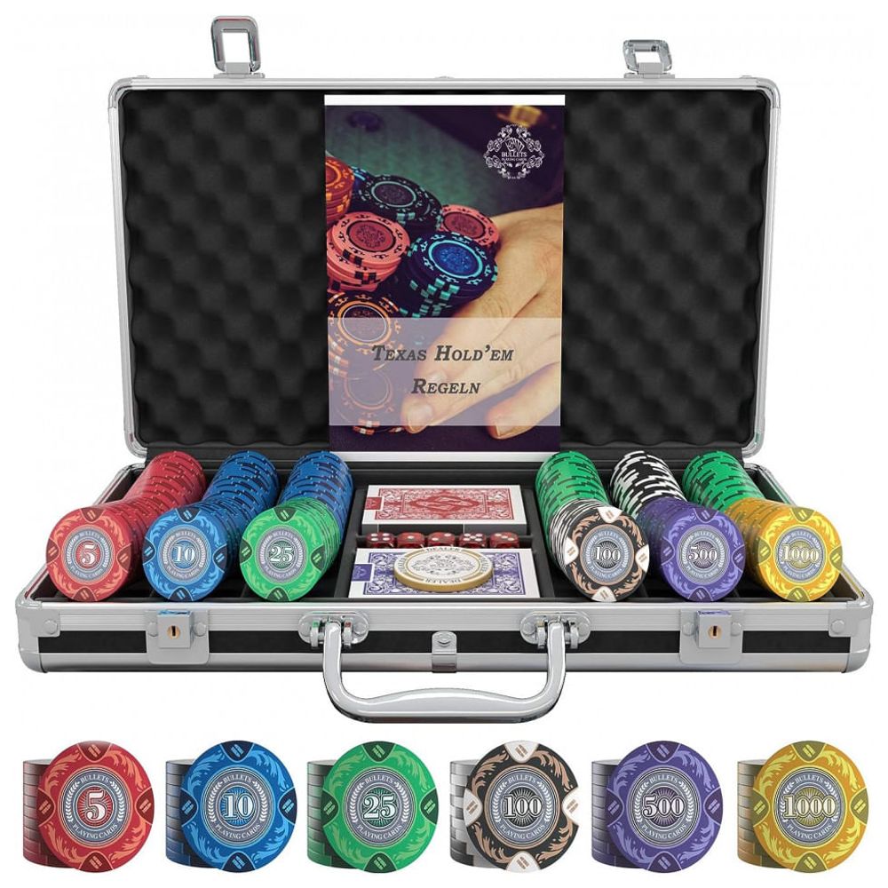 Inclui um botão de revendedor de cerâmica, 2 baralhos de cartas de pôquer de balas, 5 dados, regras de pôquer