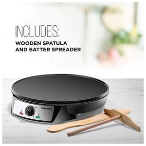 PERFEITAMENTE PRECISO Assuma o controle de sua cozinha com facilidade usando o botão de controle de temperatura preciso e a conveniente luz indicadora Ready Power. Sempre saiba assim que a temperatura desejada for atingida e adicione segurança evitando o contato com a grelha quando a luz estiver acesa. Além disso, o espalhador de massa de madeira gratuito e a espátula de bônus para distribuição perfeita e fácil criação de crepe.