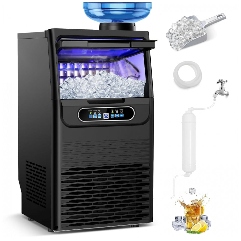 Atenção: Todos os produtos elétricos são 110V e necessitam de adaptador para a tomada no formato Brasileiro. A Máquina de Gelo Comercial RAPSUAR utiliza um compressor de 350W de alta eficiência para produzir 36 cubos de gelo claros e sólidos a cada 9-15 minutos, alcançando até 45 kg de gelo por dia. Equipada com opções duplas de entrada de água, suporta conexão direta à torneira ou garrafões, incluindo filtro de água integrado que remove impurezas para garantir gelo cristalino em cada ciclo. O painel de controle LCD intuitivo permite ajustes precisos de tempo de produção e espessura dos cubos via botões (+) e (-), com funções automatizadas de limpeza, descongelamento, agendamento e alertas de falhas para operação simplificada. O sistema de refrigeração emprega gás R290a ecológico e resfriamento por ar, garantindo operação silenciosa, resfriamento rápido e eficiência energética otimizada, reduzindo custos operacionais. Construída em aço inoxidável robusto, mede 34 cm de profundidade x 34 cm de largura x 67 cm de altura, com design versátil para instalação sob bancada, sobre bancada ou autônoma, ideal para cozinhas comerciais, bares, escritórios ou uso residencial intensivo. Inclui pá para gelo, filtro de água, mangueira de alimentação e mangueira de drenagem, facilitando a integração em diversos ambientes. Ficha Técnica Especificação Detalhes Marca RAPSUAR Modelo Máquina de gelo comercial Capacidade de armazenamento 9 kg (20 lb) Produção de gelo Até 45 kg/24h (100 lb/24h) Ciclo de produção 36 cubos em 9-15 minutos Potência 350W (compressor), 235W nominal Voltagem 110 Volts Refrigerante R290a Material Aço inoxidável Dimensões (P x L x A) 34 cm x 34 cm x 67 cm Opções de entrada de água Torneira ou garrafão Funções Painel LCD, auto-limpeza, descongelamento, agendamento Componentes inclusos Máquina, pá para gelo, filtro de água, mangueiras Cor Preto Peso 30 kg