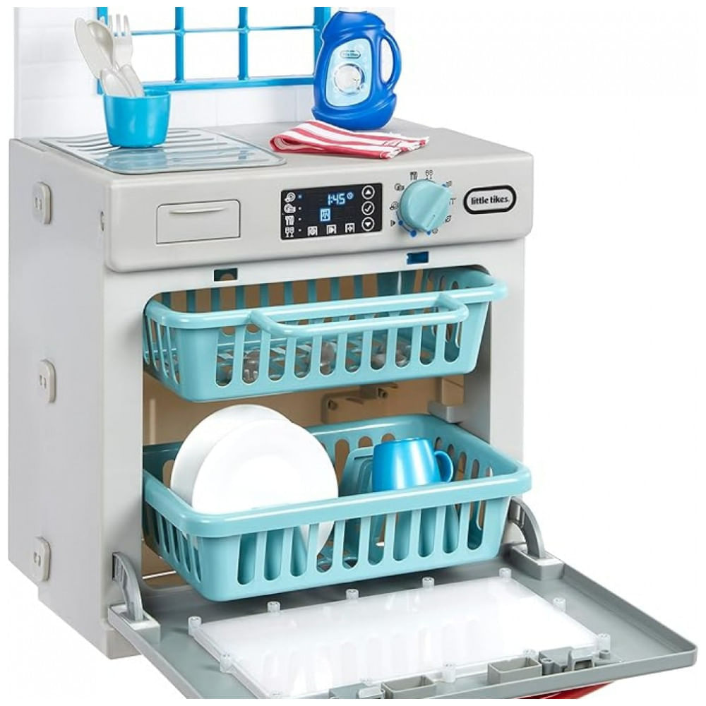 DESIGN REALÍSTICO Esta máquina de lavar louça possui luzes e sons realistas. A gaveta de detergente vira para baixo, o botão clica ao girar e as crianças podem usar o botão para ativar a máquina de lavar louça e observar os efeitos da luz da lavagem. Além disso, as prateleiras deslizantes para pratos podem ser retiradas.