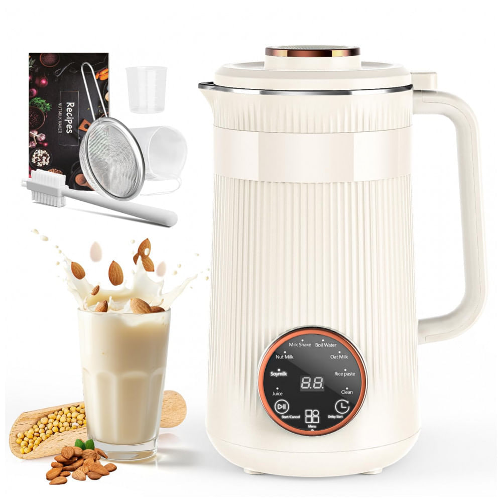 Atenção: Todos os produtos elétricos são 110V e necessitam de adaptador para a tomada no formato Brasileiro. A máquina de leite vegetal RELEXNOW HB-B1018KW3 é um equipamento de bancada com jarra de 1 litro, indicada para preparo automático de leites de soja, amêndoas, aveia, coco e outras bebidas vegetais sem lactose. O sistema utiliza 10 lâminas internas em aço inoxidável combinadas a uma coluna de agitação quadrilateral, promovendo trituração fina dos grãos e castanhas para obter bebidas mais homogêneas, com menor necessidade de filtragem. O painel com tela LED e comandos sensíveis ao toque permite selecionar diferentes funções, ajustar tempo e temperatura e acompanhar o andamento do preparo. A máquina oferece 8 modos de uso, incluindo preparo de leites vegetais, sucos, shakes, pastas de arroz, água fervente, além de função de autolimpeza. Recursos como desligamento automático e proteção contra superaquecimento aumentam a segurança durante o uso. A função de início programado de até 12 horas possibilita deixar os ingredientes preparados com antecedência para ter leite vegetal pronto ao despertar. A função manter aquecido ajuda a conservar a bebida em temperatura adequada por mais tempo após o término do ciclo. Acompanha saco para coar, peneira fina, escova de limpeza, copo medidor e livreto de receitas para auxiliar nos preparos. Ficha Técnica: Marca: RELEXNOW Modelo: HB-B1018KW3 Tipo de produto: Máquina de leite vegetal / liquidificador aquecido multifunção Cor: Branco Capacidade: 1 L Dimensões do produto (P x L x A): 32,0 cm x 20,0 cm x 20,0 cm Material da jarra: Plástico resistente Material das lâminas: Aço inoxidável Número de lâminas: 10 Potência: Não informado Voltagem: 110V Frequência: 60 Hz Funções: Preparo de leites vegetais, sucos, shakes, pasta de arroz, ferver água, autolimpeza e outros modos pré-programados Painel de controle: LED com comandos touch Recursos adicionais: Desligamento automático, proteção contra superaquecimento, timer ajustável Função início programado: Até 12 horas Função manter aquecido: Sim Acessórios incluídos: Saco para coar, peneira fina, escova de limpeza, copo medidor, livro de receitas Uso recomendado: Preparo doméstico de bebidas vegetais e complementos culinários Peso do produto: 1,9 kg Peso do pacote: 2,1 kg Manual de instruções: Inglês