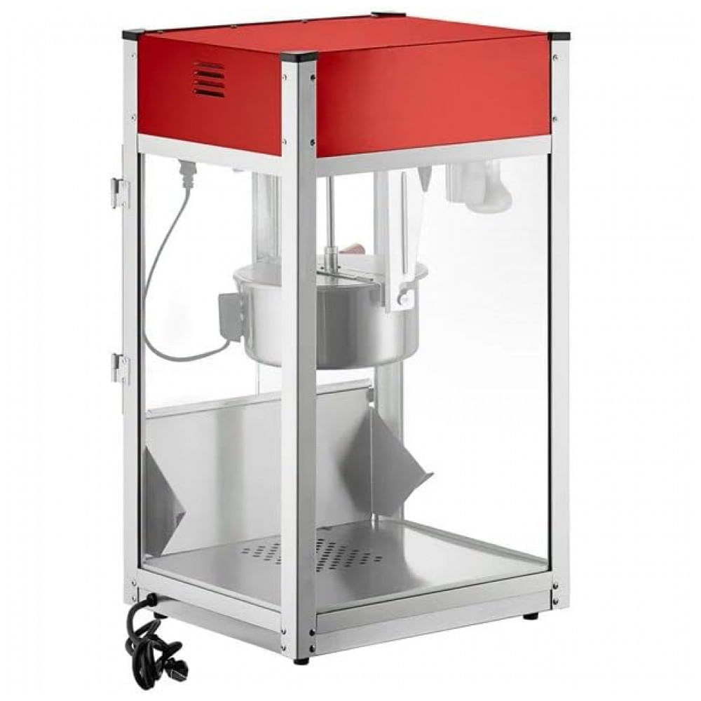 Atenção: Todos os produtos elétricos são 110V e necessitam de adaptador para a tomada no formato Brasileiro. A máquina de pipoca comercial Carnival King Glownary com caldeira de 340 g e potência de 1360W a 120V atende operações de médio volume, produzindo até 5,67 kg de pipoca por hora. Seu gabinete acomoda 1,84 kg de pipoca pronta, com deck de aquecimento para manutenção de temperatura. Ideal para estabelecimentos de food service que exigem equipamento robusto com controles simples de três chaves (agitação, aquecimento e luz de exibição). Construção e Materiais Estrutura em aço inoxidável com painéis de visualização em plástico reforçado e travas magnéticas nas portas, projetada para uso comercial contínuo. Pés ajustáveis com freios evitam deslocamentos em superfícies irregulares. Tecnologias e Funcionalidades Caldeira de aço inoxidável de 340 g gira via sistema de três chaves para operação intuitiva. Deck de aquecimento de 60W mantém pipoca aquecida; bandeja removível coleta resíduos. Indicador luminoso de 60W facilita exibição. Compatibilidade e Cuidados Compatível com rede 120V; verifique instalação elétrica local. Limpe bandeja de migalhas após uso e evite sobrecarga. Acessórios incluídos: concha para pipoca, copos medidores. Ficha Técnica Dimensões do produto: 50,8 cm (C) x 45,7 cm (L) x 76,2 cm (A) Peso do produto: 20 kg Potência: 1360W Capacidade da caldeira: 12 oz (340 g) Capacidade de armazenamento: 65 oz (1,84 kg) de pipoca pronta Materiais: aço inoxidável (estrutura e caldeira), plástico reforçado (painéis) Fonte de alimentação: 120V, elétrica Recursos especiais: grau comercial, deck de aquecimento 60W, luz de exibição 60W Faixa etária: adulto (uso profissional) Conteúdo da caixa: máquina de pipoca, concha, copos medidores, bandeja de migalhas, pés ajustáveis Manual do usuário: inglês