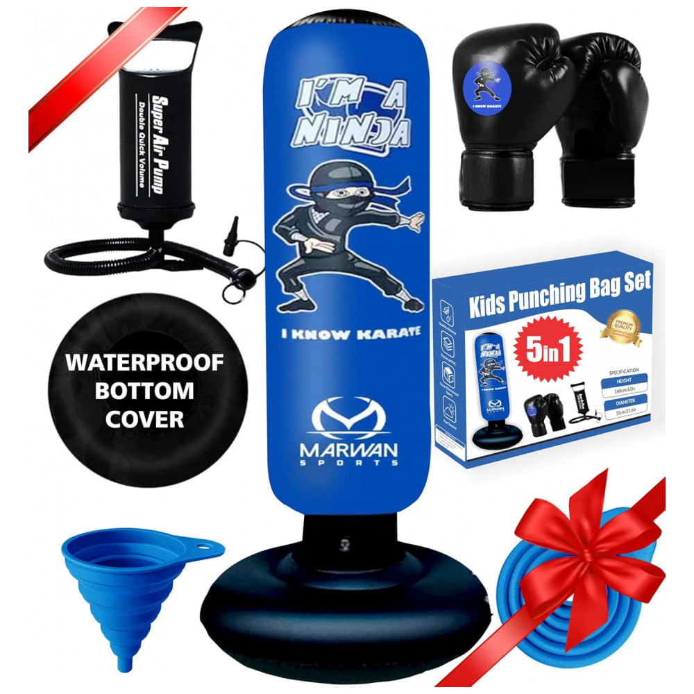 Marwan Sports Bolsa de Pancada Inflável 5 em 1 para Crianças com Luvas de Boxe – 160 cm, Base Estável e Retorno Rápido