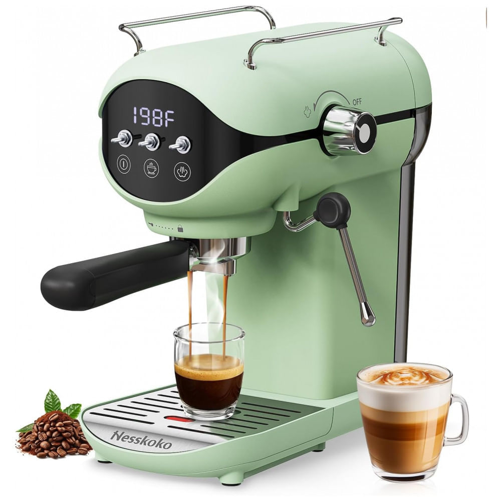 Atenção: Todos os produtos elétricos são 110V e necessitam de adaptador para a tomada no formato Brasileiro. Desfrute de uma experiência profissional no preparo do seu café com a Máquina de Espresso Nesskoko, que oferece uma performance excepcional graças à alta pressão da bomba de 20 bar. Essa alta pressão extrai melhor os óleos e sabores do café, resultando em um espresso mais rico, suave e encorpado. O controle preciso da temperatura garante que os grãos de café sejam extraídos na temperatura ideal, entregando um café equilibrado e cheio de sabor a cada preparo. Seu robusto boiler em aço inoxidável foi projetado para durar por muitos anos, assegurando uma performance consistente e duradoura. A máquina permite personalizar os shots, com opções para dose única ou dupla, além de um tempo de extração entre 25 a 30 segundos, o que evita a superextração ou subextração dos grãos, preservando o sabor perfeito do café. O poderoso espumador de leite possui uma haste de vapor em aço inox, ajustável para criar uma microespuma cremosa, rica e sedosa, ideal para cappuccinos, lattes e outras bebidas à base de leite. Além disso, o design compacto e simples dessa máquina semiautomática ocupa apenas cerca de 12x15x30 cm, não ocupando muito espaço na sua cozinha. Seu acabamento fosco na cor verde confere um toque moderno e elegante ao ambiente. Perfeita para quem busca praticidade, qualidade e estilo na preparação de cafés como espresso, latte, cappuccino, americano e macchiato, a Nesskoko é a escolha ideal para uso doméstico. Especificações: Cor: Verde, Dimensões do Produto: 30 cm (profundidade) x 15 cm (largura) x 30 cm (altura), Característica Especial: Espumador de Leite, Estilo: Chave Toggle, Uso Específico do Produto: Espresso, Acabamento Externo: Fosco, Número de Itens: 1, UPC: 768330433294, Peso do Item: 4,17 kg, Capacidade: 800 ml