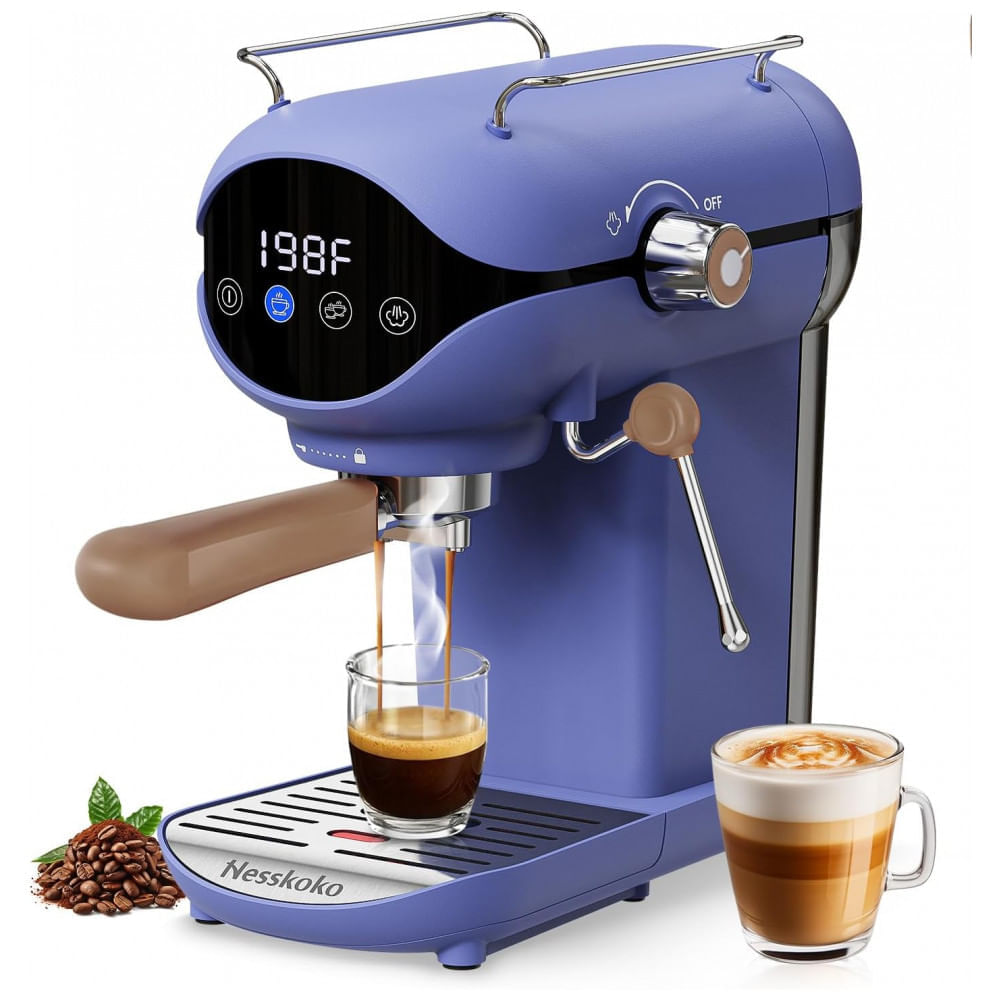 Atenção: Todos os produtos elétricos são 110V e necessitam de adaptador para a tomada no formato Brasileiro. Máquina de espresso semi-automática compacta para uso doméstico com bomba de 20 bar, projetada para extração de espressos simples ou duplos em tempo médio de 25 a 30 segundos, garantindo equilíbrio entre sabor e corpo. Possui caldeira em aço inox, controle eletrônico de temperatura, reservatório de água de 0,8L, porta-filtro para café moído e aquecedor de xícaras na parte superior. ?A máquina integra painel touch frontal, seleção de 1 ou 2 doses, vaporizador de leite em aço inox com ajuste para produção de microespuma e preparo de cappuccino, latte, Americano e outras bebidas. ? Ficha Técnica: Marca: Nesskoko ?Fabricante: Nesskoko Modelo: 768365794520 Tipo de produto: Máquina de espresso semi-automática Cor: Azul Capacidade do reservatório: 0,8L ?Pressão da bomba: 20 bar ?Dimensões do produto (P x L x A): 30,0 cm x 14,7 cm x 30,5 cm ?Peso do produto: 4,1 kg Tipo de café utilizado: Café moído Tipo de operação: Semi-automática com seleção de 1 ou 2 doses Material da caldeira: Aço inox Controle de temperatura: Controle eletrônico para extração em faixa ideal Tempo de extração: 25 a 30 s por dose Porta-filtro: Metálico com bico duplo Função de aquecimento de xícaras: Placa superior aquecida Vaporizador de leite: Lança de vapor em aço inox ajustável Bebidas indicadas: Espresso, duplo espresso, cappuccino, latte, Americano, macchiato Interface de usuário: Painel com botões touch Fonte de alimentação: Elétrica Tensão: 110V ?Uso indicado: Uso residencial para preparo de bebidas à base de espresso Ambiente de uso: Interno Itens inclusos: Máquina de espresso e vaporizador de leite integrado Manual do usuário: Inglês