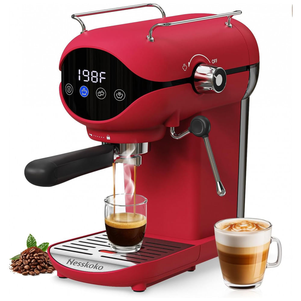 Atenção: Todos os produtos elétricos são 110V e necessitam de adaptador para a tomada no formato Brasileiro. Desfrute de um café espresso profissional diretamente na sua casa com a Máquina de Espresso Nesskoko, que oferece alta performance com sua bomba de 20 bar de pressão, extraindo de forma eficiente os óleos e sabores do café, resultando em um espresso mais rico, suave e encorpado. O controle preciso de temperatura garante que o café seja extraído na temperatura ideal, proporcionando um sabor equilibrado e delicioso em cada xícara. Equipado com uma caldeira de aço inoxidável durável e robusta, este equipamento foi projetado para oferecer longa vida útil e performance consistente por muitos anos. Possui ainda a função de personalização das doses, permitindo preparar uma ou duas doses em um tempo de extração ideal entre 25 a 30 segundos, garantindo sempre o máximo aproveitamento dos sabores sem riscos de sub ou superextração. O potente vaporizador de leite em aço inox ajustável permite criar microespuma de leite cremosa, rica e sedosa, perfeita para preparar lattes, cappuccinos e outras bebidas à base de leite com qualidade de cafeteria. Além disso, sua construção compacta e semiautomática é extremamente fácil de usar, ocupando pouco espaço na bancada com apenas 30 cm de profundidade, 14,7 cm de largura e 30,5 cm de altura, tornando-a ideal para qualquer cozinha. Com acabamento fosco na elegante cor vermelha e tela touchscreen intuitiva, a máquina proporciona um design moderno e funcional, que alia beleza, tecnologia e performance para transformar seu momento do café. A Nesskoko é a escolha perfeita para quem busca versatilidade, qualidade e praticidade na hora de preparar espressos, lattes, cappuccinos, americanos e macchiatos diretamente em casa. Especificações: Cor: Vermelho, Dimensões do Produto: 30 cm (Profundidade) x 14,7 cm (Largura) x 30,5 cm (Altura), Recurso Especial: Espumador de Leite, Estilo: Tela Touch, Uso Específico do Produto: Espresso, Acabamento Externo: Fosco, Número de Itens: 1, UPC: 768330433263, Peso do Item: 4,1 kg, Capacidade: 800 ml