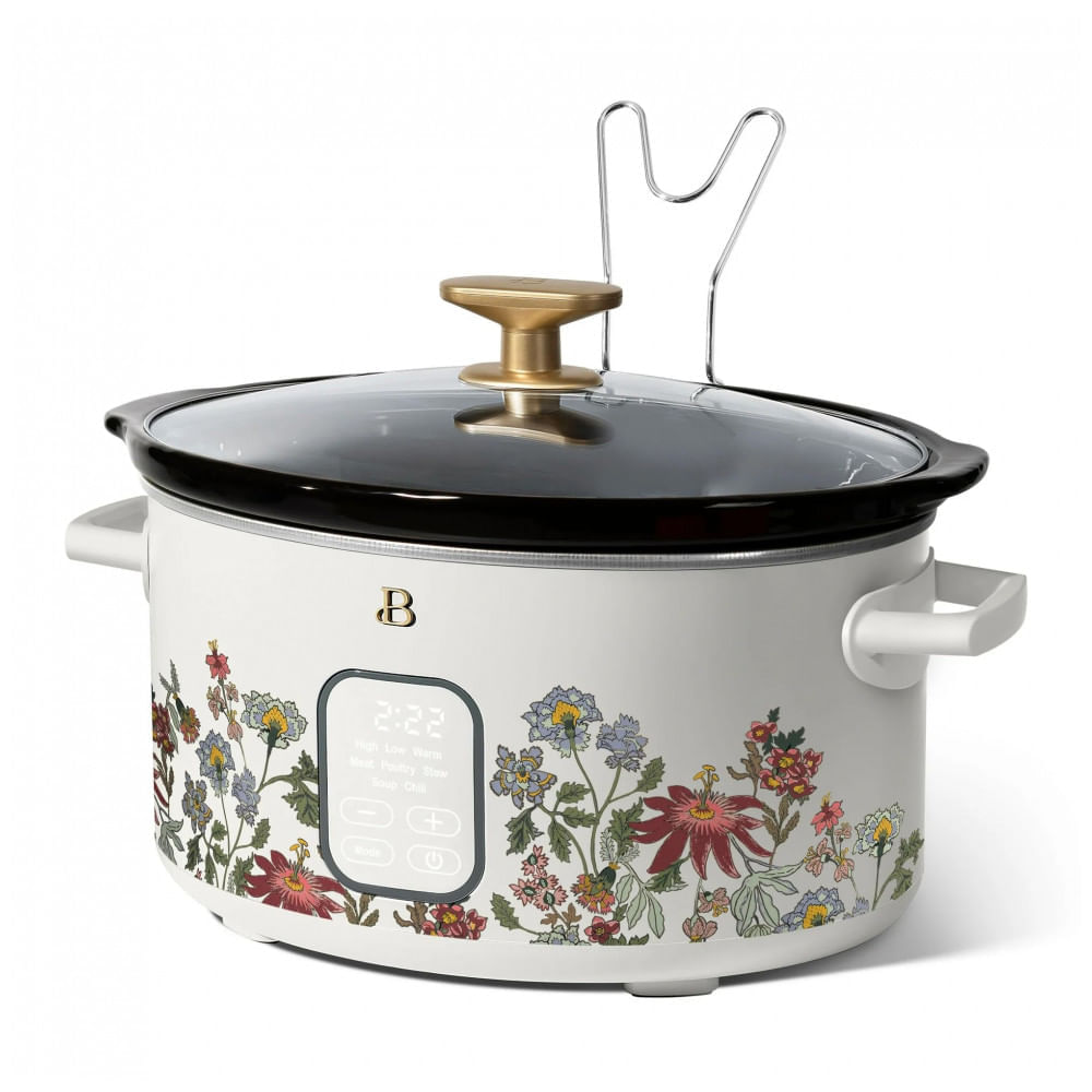 Atenção: Todos os produtos elétricos são 110V e necessitam de adaptador para a tomada no formato Brasileiro. Panela elétrica de cozimento lento com capacidade de aproximadamente 5,7 litros, indicada para preparo de refeições para até 7 pessoas, ideal para jantares em família, marmitas da semana e receitas em grandes porções. O aparelho oferece 5 funções pré-programadas para carnes, aves, ensopados, sopas e chili, com painel digital tátil e temporizador programável de 30 minutos até 24 horas, que ao final entra automaticamente em modo manter aquecido. A cuba interna é em cerâmica removível e a tampa em vidro temperado resistente a impacto, ambas compatíveis com lava-louças, o que facilita a limpeza após o uso. As alças laterais possuem toque frio para manuseio mais seguro, e a base conta com acabamento em aço inox e detalhes em dourado, com painel que acende apenas durante o uso, conferindo visual moderno para bancada de cozinha. Ficha Técnica: Marca: Beautiful (linha Drew Barrymore, sob fabricante Made By Gather) Fabricante: Made By Gather Modelo: 19166 Categoria: Panela elétrica de cozimento lento programável Cor: Branco Wildflower Capacidade: 5,7 litros Potência: 210W Tensão: 120V Material da cuba: Cerâmica removível Material da tampa: Vidro temperado resistente a impacto Material da carcaça: Metal com acabamento em aço inox e pintura fosca Dimensões aproximadas do produto (P x L x A): 43,6 cm x 28,5 cm x 30,3 cm Peso do produto: 6,5 kg Tipos de função pré-programada: Carne, aves, ensopado, sopa, chili Faixa do timer programável: De 30 minutos até 24 horas Modos de aquecimento: Alta, baixa e manter aquecido Função manter aquecido automática: Sim, após término do tempo programado Painel de controle: Display digital com botões sensíveis ao toque Tipo de controle: Controle eletrônico digital Alças: Alças laterais com toque frio Base de apoio: Base estável com pés antiderrapantes Componentes compatíveis com lava-louças: Cuba cerâmica e tampa de vidro Recursos de segurança: Tampa em vidro temperado, alças frias e operação em baixa potência Público recomendado: Uso doméstico em cozinhas residenciais Uso indicado: Cozimento lento de carnes, sopas, caldos, ensopados, molhos e receitas de longo tempo de preparo Voltagem: 110V Conteúdo da embalagem: 1 base aquecedora, 1 cuba cerâmica, 1 tampa de vidro temperado, 1 suporte metálico de tampa, manual do usuário em inglês Manual do usuário: Inglês