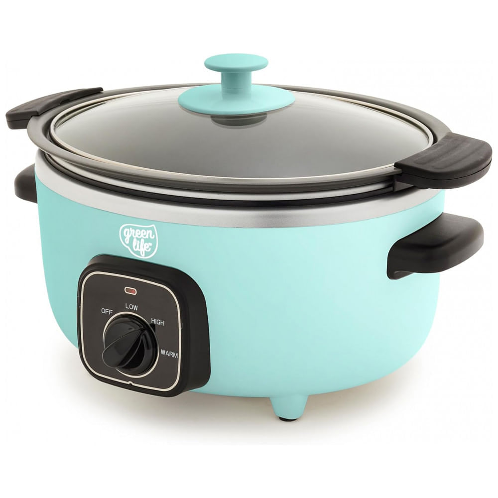 Atenção: Todos os produtos elétricos são 110V e necessitam de adaptador para a tomada no formato Brasileiro. A Panela Elétrica GreenLife torna fácil preparar refeições deliciosas sem preocupações. Com sua panela removível de 3,31 litros, é ideal para sopas, ensopados, chilli e muito mais. Seu design compacto economiza espaço na bancada e nos armários. A panela removível pode ser usada no fogão e forno a até 204°C, permitindo dourar os alimentos antes de cozinhar lentamente. O revestimento cerâmico antiaderente da GreenLife facilita a limpeza, sendo livre de PFAS para refeições mais saudáveis. O seletor de controle simples possui configurações de Baixo, Alto e Manter Aquecido para se adaptar à sua receita e rotina, enquanto a tampa de vidro transparente permite monitorar a comida sem perder calor. Quando a comida estiver pronta, basta girar o botão para Manter Aquecido e servir no seu tempo. Além disso, a panela removível e a tampa podem ser lavadas na lava-louças para facilitar a limpeza. CAPACIDADE DE 3,5 LITROS PERFEITA projetada para cozinhar sopas, ensopados, chili, assados e muito mais no dia a dia. Além disso, o tamanho conveniente economiza espaço sem comprometer o sabor. PANELA PRONTA PARA O FOGÃO A panela leve pode ser removida para uso no fogão e forno a até 204°C, para dourar e cozinhar lentamente com mais sabor. REVESTIMENTO CERÂMICO ANTIADERENTE SAUDÁVEL O revestimento cerâmico saudável e fácil de limpar da GreenLife proporciona liberação fácil dos alimentos com uma limpeza rápida. LIVRE DE TOXINAS O revestimento cerâmico antiaderente livre de PFAS da GreenLife proporciona refeições sem preocupações. PAINEL DE CONTROLE FÁCIL DE USAR 3 Configurações de Calor - Baixo, Alto, Manter Aquecido ENCONTRE A TEMPERATURA CERTA Se você precisa cozinhar em fogo baixo por mais tempo ou deseja acelerar o processo, as 3 configurações de temperatura tornarão suas refeições simples. TAMPA DE VIDRO TRANSPARENTE Uma tampa de vidro transparente permite que você acompanhe o preparo da sua receita. FÁCIL DE LIMPAR Limpe a tampa e a panela com um pano ou coloque na lava-louças para sujeiras difíceis. FUNÇÃO MANTER AQUECIDO Gire o botão para Manter Aquecido e mantenha sua refeição quente e pronta para servir sem cozinhar demais ou ressecar. ALÇAS LATERAIS DURÁVEIS As alças ficam frias ao toque, proporcionando uma aderência segura para transferências sem problemas. Especificações: Cor: Turquesa, Material: Cerâmica, Dimensões do Produto: 29,74 cm de diâmetro x 18,49 cm de largura x 11,76 cm de altura, Capacidade: 3,31 litros, Potência: 240 watts, É Seguro para Lava-Louças: Sim, Voltagem: 110 Volts, Padrão: Sólido, Método de Controle: Toque, Tipo de Controlador: Programável, Tamanho: 3,31 litros, UPC: 885837052657, Peso do Item: 2,33 kg, Fabricante: GreenLife, Número do Modelo: CC009977-001