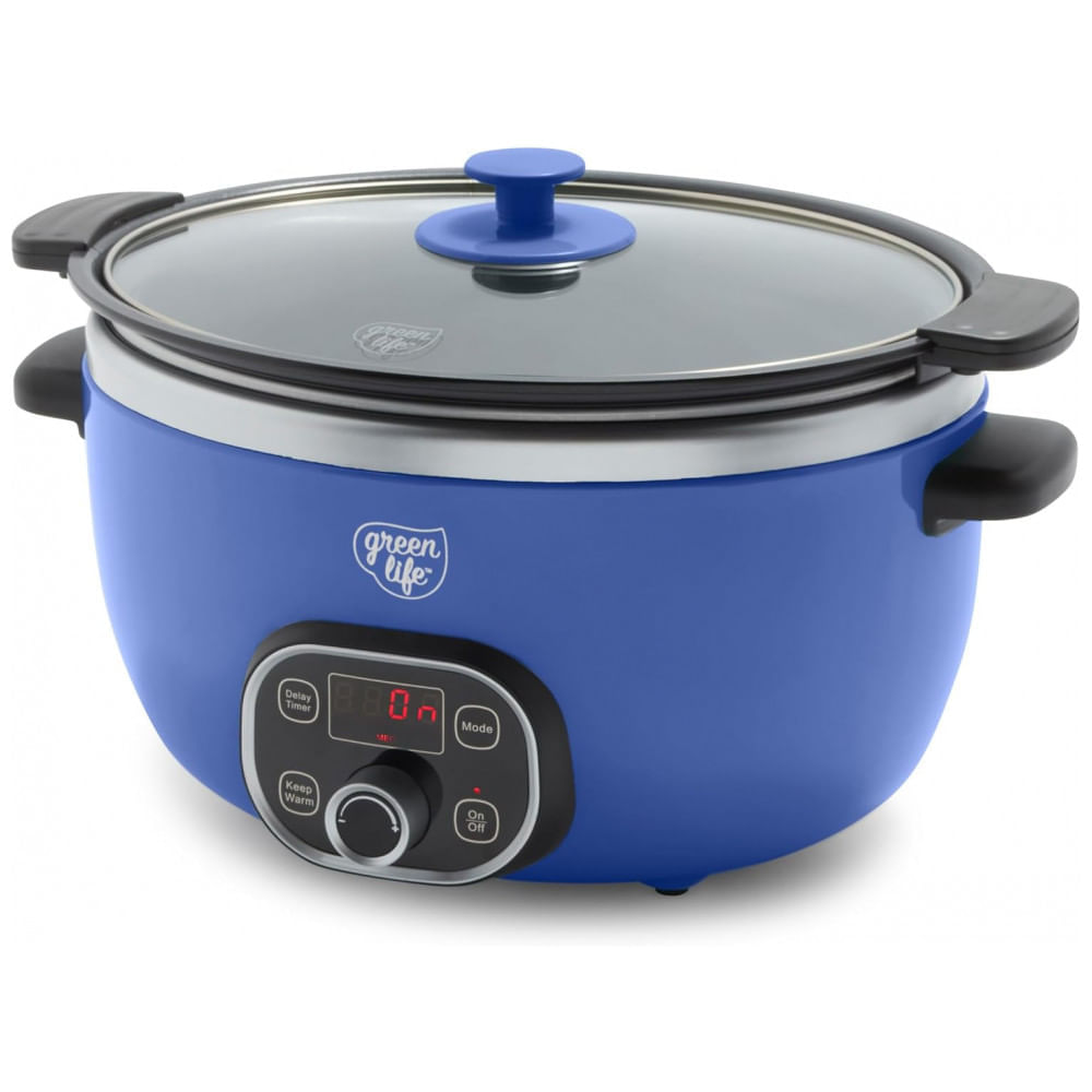 Atenção: Todos os produtos elétricos são 110V e necessitam de adaptador para a tomada no formato Brasileiro. A Panela Elétrica GreenLife 5,68 litros é um item versátil e prático. Sua panela antiaderente removível facilita a selagem e refogado dos alimentos, sendo ideal para preparações lentas. Com capacidade de 5,68 litros e revestimento cerâmico saudável, livre de substâncias tóxicas como PFAS, PFOA, chumbo e cádmio, garante refeições mais saudáveis e saborosas. O painel de controle oferece cinco funções de cozimento, permitindo programar o preparo por até 10 horas e manter a comida aquecida por até 4 horas. A panela e a tampa são seguras para lava-louças, facilitando a limpeza. Leve e removível, a panela pode ser usada no fogão e forno, proporcionando mais opções de preparo para realçar o sabor dos pratos. Com design moderno, a tampa de vidro transparente permite visualizar o cozimento. Ideal para refeições em família, preparo antecipado de alimentos e eventos. Aproveite a praticidade e eficiência da Panela Elétrica GreenLife! Especificações: Cor: Azul, Material: Cerâmica, Dimensões do Produto: 38,86 cm D x 28,19 cm L x 25,5 cm A, Capacidade: 5,68 Litros, Potência: 240 watts, Peso do Item: 4 kg, Voltagem: 110., Padrão: Sólido, Método de Controle: Toque, Tipo de Controle: Programável, Número de Configurações: 5, Profundidade do Item: 27,94 cm, Tipo de Controlador: Manual, Modelo: CC008506-001, UPC: 885837043327, Código de Identificação Global de Comércio: 00885837043327, Fabricante: GreenLife, Número do Modelo do Item: CC008506-001