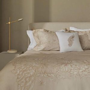 Villa Ravino é um jardim com especies de plantas e animais exoticos de varios lugares do mundo. Soberano, o Povão Albino no bordado representa a rara beleza deste refúgio. Invadido por este espírito livre, a proposta da cama Villa Ravino é elucidar a sofisticação do bordado que sobressai aos tons sóbrios. Diferênciais: Peseira com estampa dimensionada. Acabamento: Tecido mercerizado. Composição: Cetim 300 fios 100% Algodão Egípcio