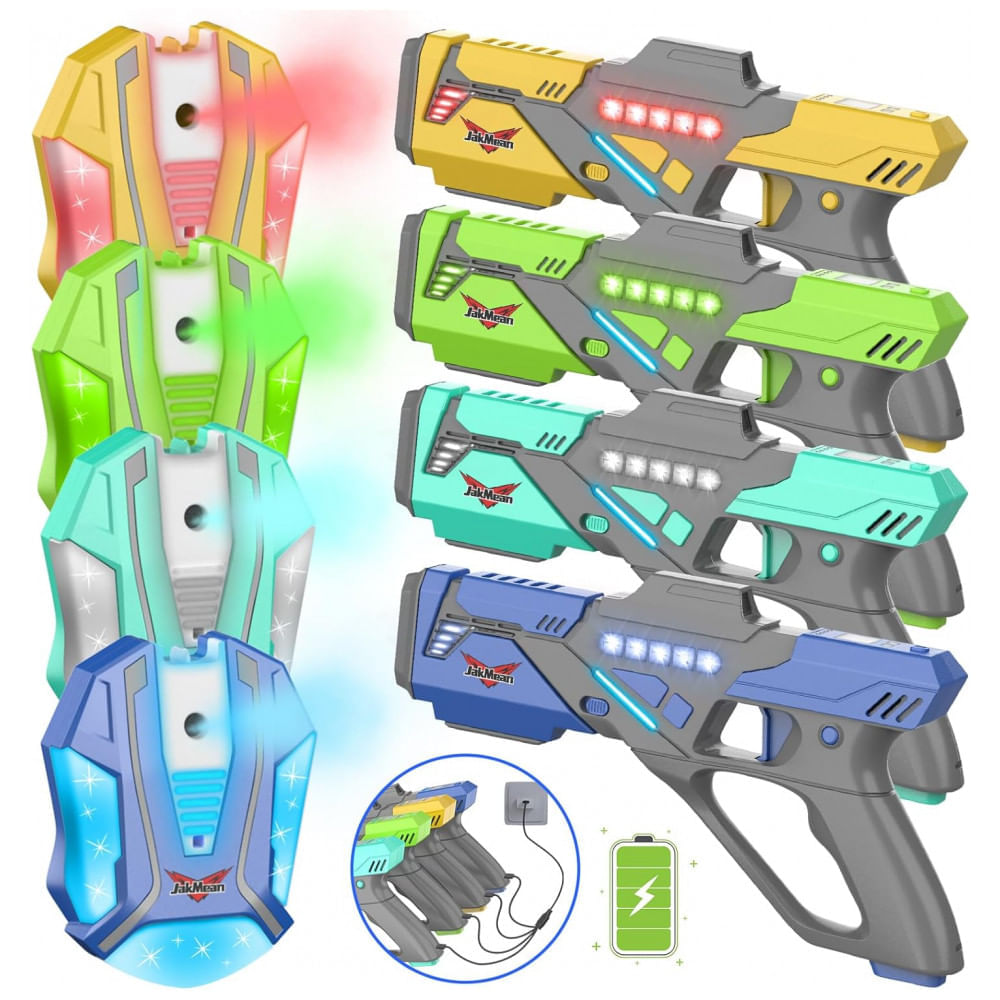 Cada pistola e colete são recarregáveis, garantindo que a diversão não tenha fim. As luzes vibrantes e os efeitos sonoros realistas tornam cada jogo ainda mais envolvente, enquanto os coletes recarregáveis oferecem uma camada extra de estratégia e desafio.