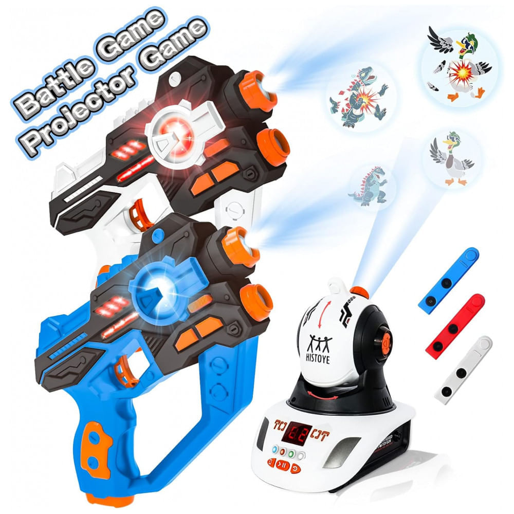 Modos Multi Play: O conjunto de laser tag tem dois modos com projetor, basta apontar o projetor em qualquer parede interna, haverá padrões claros, então aponte as s rapidamente para os padrões e atire neles, quando você acertar um padrão com sucesso, ele explodirá e cairá e você receberá a pontuação, quem obtiver mais pontuação é o vencedor. Além disso, existem jogos ao ar livre, apenas com s de laser tag, selecione o time que deseja jogar e depois atire. vamos começar o jogo lazer tag