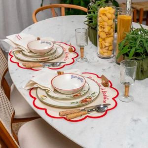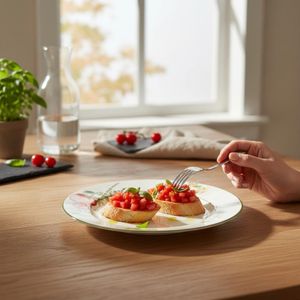 Sua confecção em cerâmica superior garante robustez e durabilidade, ideal para o uso diário sem perder o charme artesanal. A estampa Pomodoro e Basilico é o grande diferencial, apresentando uma aquarela vibrante de tomates maduros e manjericão fresco. Este design temático confere personalidade instantânea à mesa, harmonizando-se perfeitamente com cozinhas rústicas ou modernas.