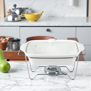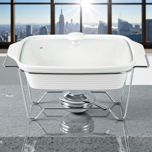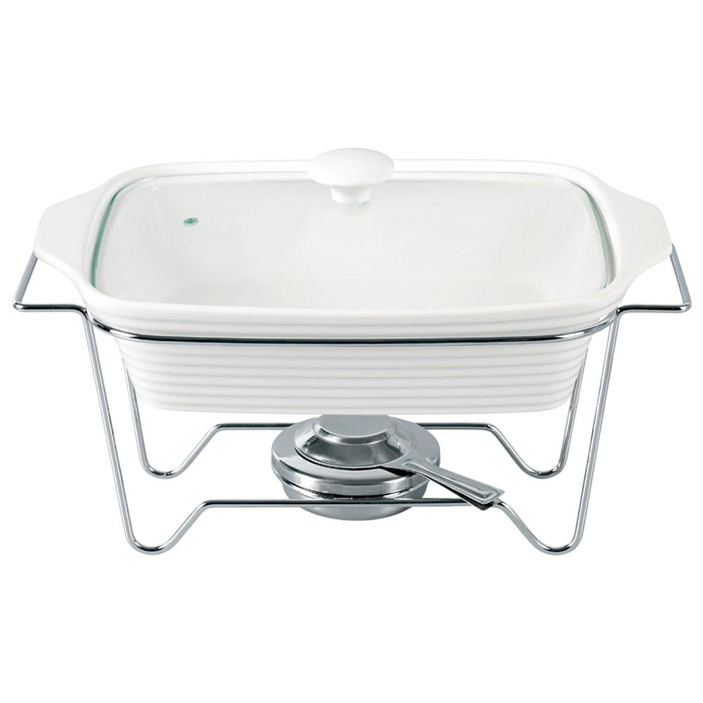 Com 38 cm de comprimento por 23 cm de largura, o refratário oferece espaço amplo para servir. O suporte com queimador (para álcool gel ou pastilhas, não inclusos) garante que o aquecimento seja suave e contínuo. A altura total de 17 cm facilita o acesso dos convidados no buffet.