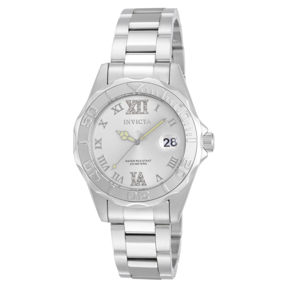 Atenção: Todos os produtos elétricos são 110V e necessitam de adaptador para a tomada no formato Brasileiro. Este incrvel relgio Invicta da coleo Pro oferece um movimento exato, com uma incrvel caixa de ao. O mostrador exibe um mostrador de metal prateado protegido por nosso Cristal Mineral proprietrio. O design completado por uma faixa de ao inoxidvel. Este relgio pode resistir gua por at 100 m. Mergulhe em qualquer horizonte usando a orientao constante do Invicta Pro. Elegantemente clssico, o funcionamento interno forjado com variaes de movimentos ousados. Construdos com destreza confiante, a fortaleza com que estes relgios funcionam faz do Pro a quintessncia em desempenho. Desde a fundao da Invictas, h mais de um sculo, at os dias atuais, a inovao e a excelncia tm estado no centro de cada poca e coleo ao longo da histria da marca. . Aqui nas lojas Invicta voc encontrar a maior seleo de relgios Invicta em qualquer lugar online, alm de atendimento ao cliente superior, garantia de 3 anos e o melhor valor sempre. . Especificaes do produto: Cor do mostrador: Prata Material do mostrador: Metal Tamanho da caixa: 38 Tom da caixa: Ao Material da Caixa: Ao Funo de moldura: Unidirecional Tipo de coroa: Empurrar Tipo de Pedra: Cristal Cor Luminosa: Verde Material Luminoso: Tritnita Tipo de movimento: Componentes de movimento: Japo Fornecedor de movimento: TMI Calibre de Movimento: PC32A Material da pulseira: Ao Inoxidvel Comprimento da banda mm: 180 Tamanho da banda mm: 18 Tipo de fivela: Banda intercambivel: No Tipo de fecho: dobrvel, segurana Cdigo da famlia do produto: PF0840 Tom da banda: tom prateado Tipo de Cristal: Mineral Funo crongrafo: Nenhum Funo de calendrio: Data Categoria: Relgios Gnero: Feminino