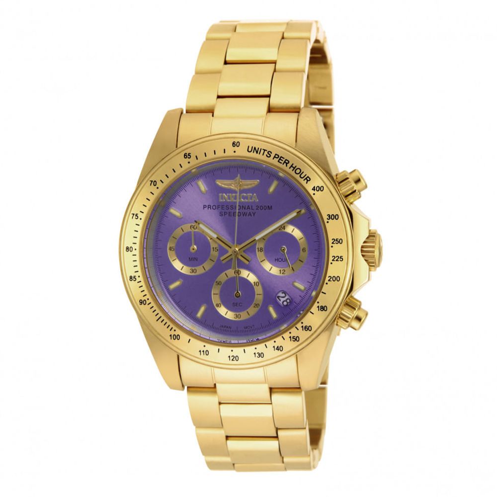 Atenção: Todos os produtos elétricos são 110V e necessitam de adaptador para a tomada no formato Brasileiro. Este relógio Invicta da coleção Speedway possui um movimento de quartzo e possui uma caixa de ouro resistente. Em sua face, você pode encontrar um mostrador de metal roxo coberto por um cristal mineral durável. Este estilo é finalizado por uma pulseira de aço inoxidável dourada confiável e oferece resistência à água de 200 m.
