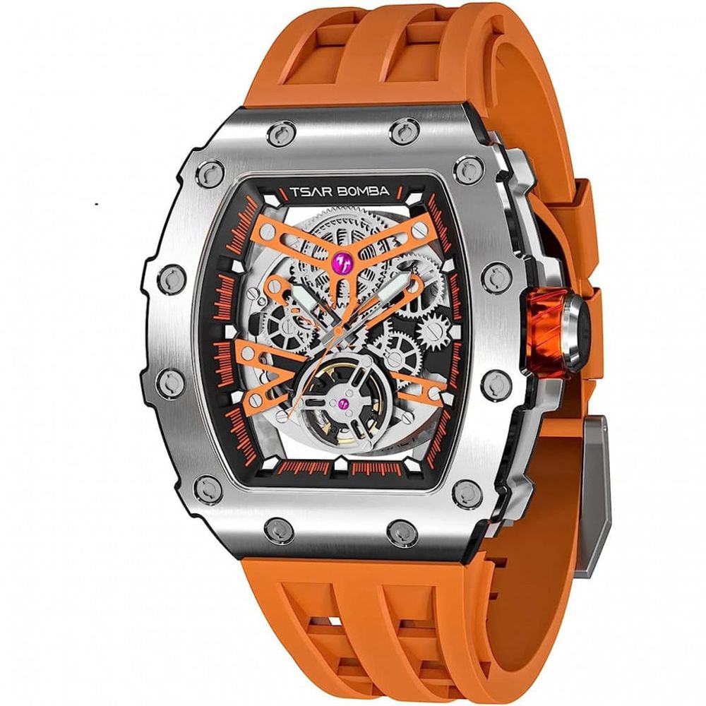 Atenção: Todos os produtos elétricos são 110V e necessitam de adaptador para a tomada no formato Brasileiro. Caixa em forma de Tonneau Todos sabemos que os relógios têm sido um símbolo de homens de sucesso. Nossa marca de nova geração quer destacar o gosto e o temperamento das pessoas com um luxo personalizado ou mais leve. Este relógio de luxo masculino TSAR BOMBA incorpora o elemento mais quente do relógio de pulso hoje, a caixa em forma de tonel. As engrenagens mecânicas e o design oco que representam poder no mostrador fazem com que pareça luxuoso e elegante. Caixa de aço inoxidável 316L Vidro de safira Os relógios masculinos TSAR BOMBA são projetados ergonomicamente com uma caixa central ligeiramente mais grossa e laterais ligeiramente mais finas para um melhor ajuste no pulso. Este relógio masculino apresenta uma caixa de aço inoxidável 316L e um vidro de borda arqueada de safira artificial com nível de dureza Mohs 9. Este material de aço inoxidável é amplamente em bisturis, que é resistente a arranhões e safira artificial resistente à corrosão é a coisa mais forte na natureza, exceto diamantes . Correia de silicone com movimento mecânico Este relógio TB8208 está equipado com um movimento japonês MIYOTA. Comparado com os movimentos comuns, este custa mais e é mais estável, garantindo a precisão do relógio. Use o por pelo menos 8 a 10 horas por dia para manter a operação. Quando não conseguir energia suficiente, gire a coroa manualmente por cerca de 30 voltas para dar corda no relógio. Ele é testado por mais de 72 horas antes de sair da fábrica para garantir a precisão e o desempenho superior de cada relógio. Melhor presente à prova dágua de 50M Este relógio de moda masculina é resistente à água até 50M 5ATM com uma caixa totalmente selada e um anel triplo de borracha à prova dágua na coroa para garantir seu desempenho. Pode suportar a lavagem das mãos, lavagem do carro e natação de curto prazo. Por favor, não o use em um banho de água quente ou ajuste a coroa debaixo dágua.