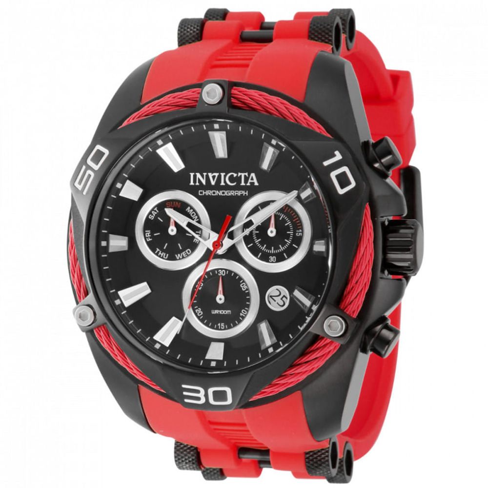 Atenção: Todos os produtos elétricos são 110V e necessitam de adaptador para a tomada no formato Brasileiro. Este lindo relógio Invicta Bolt contém um movimento de quartzo preciso, além de uma caixa preta. Seu mostrador exibe um mostrador de metal preto prateado protegido por um Cristal Flame Fusion de alta resistência. Este relógio é completado por uma pulseira de aço inoxidável vermelha, preta, silicone e oferece resistência à água de até 100 m.