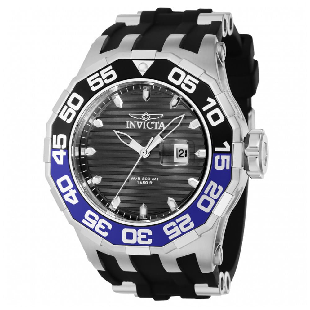 Atenção: Todos os produtos elétricos são 110V e necessitam de adaptador para a tomada no formato Brasileiro. Este lindo relógio Invicta Speciality contém um movimento preciso de quartzo, além de uma caixa de aço preta, azul, prateada. Seu mostrador exibe um mostrador de metal preto protegido por um Cristal Mineral de alta resistência. Este relógio é completado por uma pulseira de aço preto, aço inoxidável e silicone e oferece resistência à água de até 500 m.