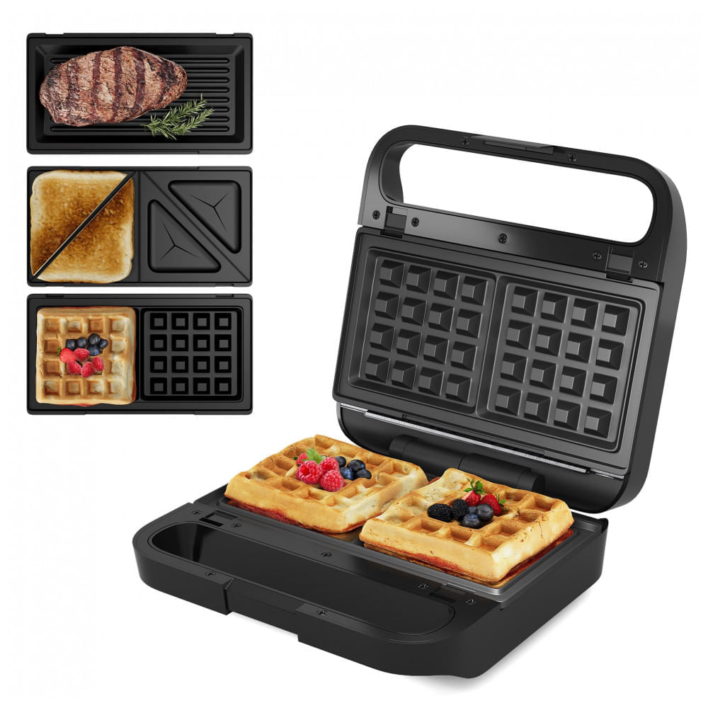 Atenção: Todos os produtos elétricos são 110V e necessitam de adaptador para a tomada no formato Brasileiro. A sanduicheira 3 em 1 Sunvivi oferece três placas internas removíveis para preparar sanduíches, waffles, ovos fritos, paninis e carnes em fatias finas. Com potência de 850W e 3 configurações de uso, permite adaptação a diferentes alimentos como queijo grelhado, bifes, hash browns e almôndegas. Seu design compacto com tampa de vidro e alça com toque frio facilita o monitoramento visual e o manuseio durante o preparo em cozinhas residenciais. Equipada com placas antiaderentes removíveis, a máquina de waffles elétrica Sunvivi utiliza material em alumínio para distribuição uniforme de calor. A tampa de vidro transparente permite visualização do processo de cocção sem abertura. Possui 3 configurações selecionáveis para ajustar o nível de cozimento em sanduíches, waffles ou grelhados. As placas se adaptam a múltiplos formatos de alimentos. Compatível com voltagem de 120V (AC), ideal para uso em redes elétricas padrão. Inclui 3 placas intercambiáveis no pacote. Para limpeza, remova as placas antiaderentes e lave com água e detergente neutro. Armazene em local seco após resfriamento total. Ficha Técnica Dimensões do produto: 22,9 cm (P) x 9,4 cm (L) x 22,9 cm (A) Peso: 3 kg Potência: 850W Voltagem: 120V (AC) Capacidade: 3 configurações de uso; 3 placas removíveis (sanduíches, waffles, grelhados) Materiais: alumínio com revestimento antiaderente; tampa de vidro Fonte de alimentação: cabo elétrico AC Faixa etária: adultos (uso supervisionado para crianças) Conteúdo da caixa: sanduicheira 3 em 1, 3 placas de cozimento Manual do usuário: inglês