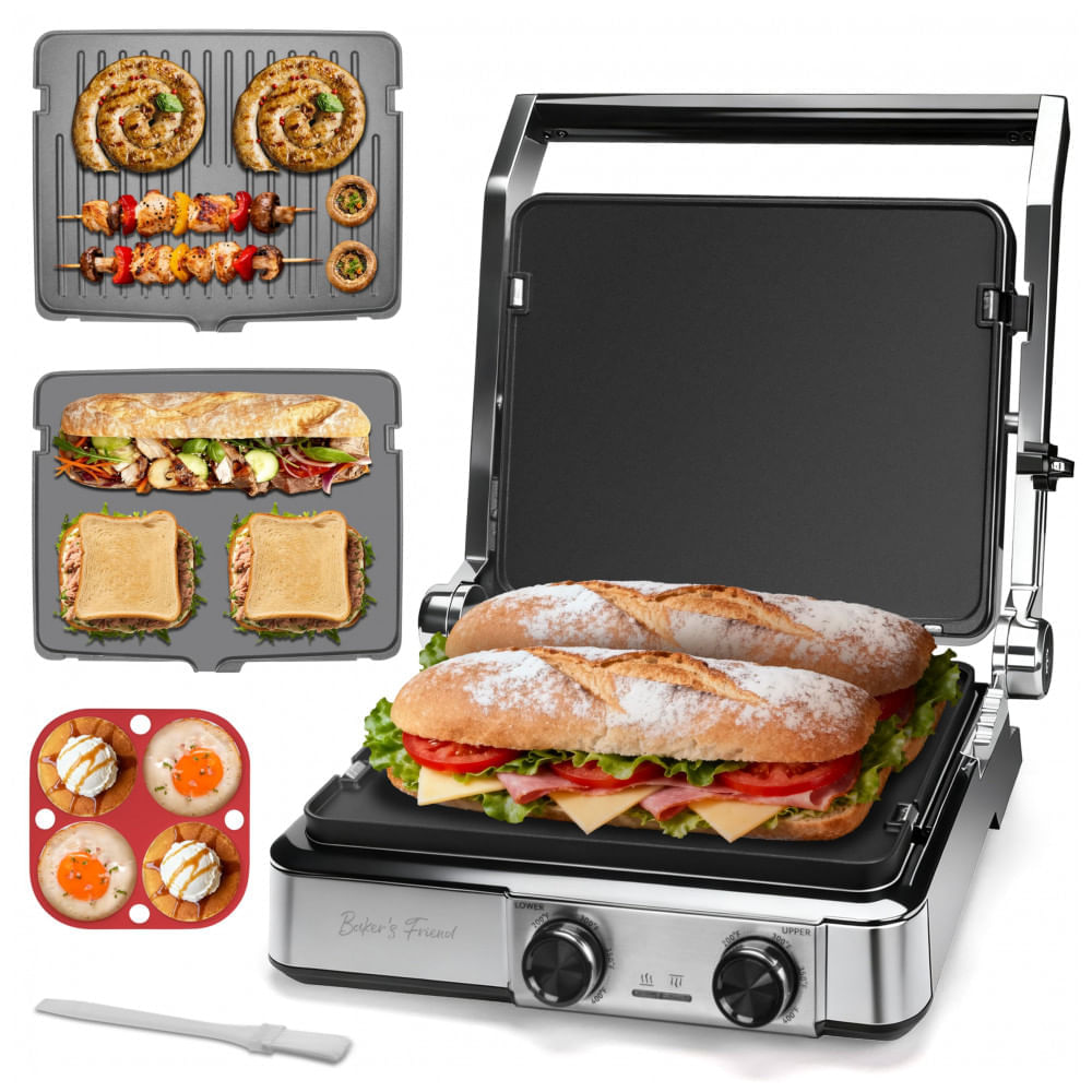 Atenção: Todos os produtos elétricos são 110V e necessitam de adaptador para a tomada no formato Brasileiro. A sanduicheira elétrica Baker's Friend 4-slice Panini Press Grill com 1400W permite preparar paninis, sanduíches grelhados, queijos tostados, panquecas, ovos fritos, carnes e vegetais com abertura 180° para uso como chapa. Tampa ajustável em aço inoxidável com mecanismo de trava adapta-se a espessuras variadas de recheios, suportando preparos simultâneos de 4 porções em cozinhas domésticas. Dimensões de 36,6 cm profundidade x 13,5 cm largura x 33 cm altura acomodam superfícies de bancada padrão. Tecnologia de aquecimento dual-zone mantém placa superior em temperatura ligeiramente inferior à inferior, selando sucos de carnes rapidamente para crosta externa e interior macio. Placas reversíveis incluem molde de silicone 4-circle para preparos estruturados. Luzes indicadoras vermelho/verde sinalizam operação e prontidão, com bandeja de gotejamento removível para coleta de gordura excessiva. Design facilita limpeza após resfriamento em uso familiar ou social. Cuidados incluem desconexão da tomada, remoção da bandeja para lavagem e limpeza das placas antiaderentes com pano úmido após resfriamento completo. Ficha Técnica Dimensões do produto: 36,6 cm (P) x 13,5 cm (L) x 33 cm (A). Peso do item: 6 kg. Potência: 1400W. Capacidade: 4 fatias simultâneas (paninis, sanduíches, grelhados). Materiais: aço inoxidável na tampa; metal/plástico com antiaderente nas placas; molde silicone 4-circle. Fonte de alimentação: elétrica 120V. Faixa etária: adultos e maiores de 12 anos com supervisão. Conteúdo da caixa: 1 sanduicheira principal, placas reversíveis, molde silicone, bandeja gotejamento removível, livreto de receitas. Instruções de cuidado: placas e bandeja com pano úmido ou lave-louças; não submersível. Manual do usuário: inglês.