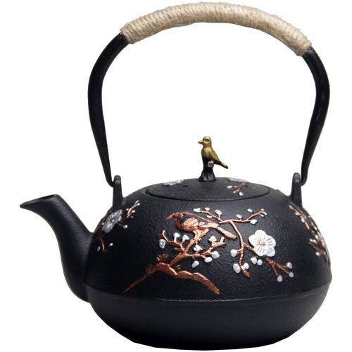 A chaleira de ferro fundido tem um infusor de malha de aço inoxidável removível para macerar chás de folhas soltas.
