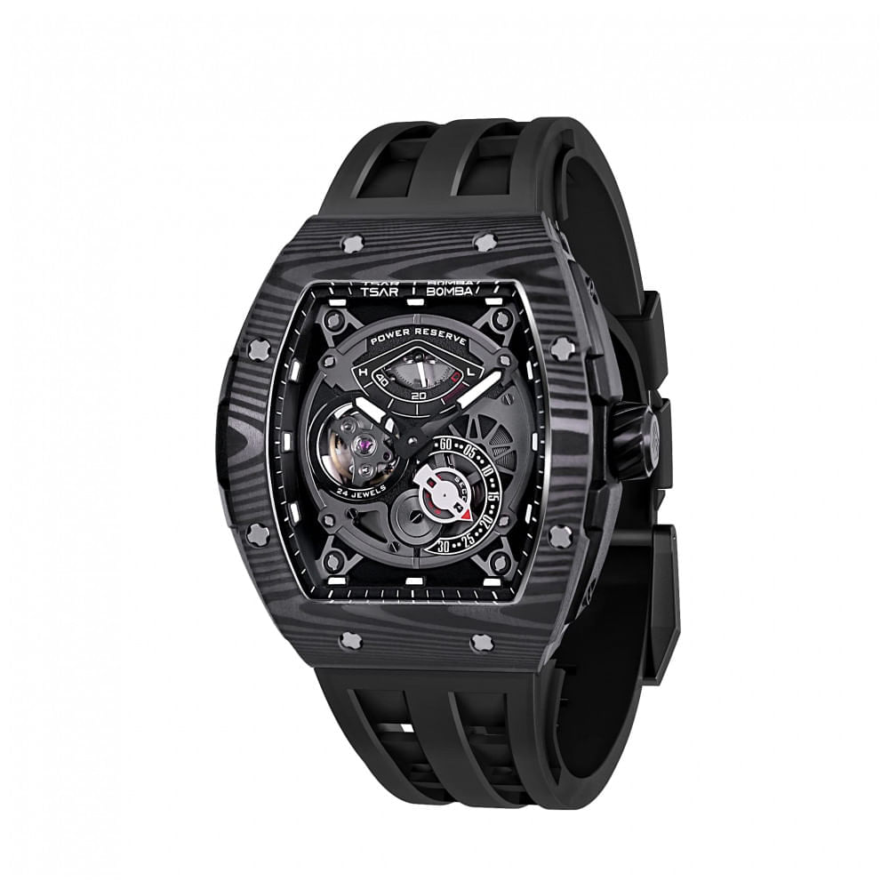 Atenção: Todos os produtos elétricos são 110V e necessitam de adaptador para a tomada no formato Brasileiro. O relógio automático TSAR BOMBA é uma obra-prima que combina alta qualidade e excelente artesanato. O modelo TB 8210 impressiona com sua precisão na medição do tempo e seu design sofisticado, que revela a beleza da arte mecânica esqueleto. No mostrador, um indicador de reserva de energia posicionado às 12 horas funciona como um painel de óleo de carro: quando o ponteiro alcança a zona vermelha, é necessário dar corda manualmente para armazenar energia. Construído com materiais premium, o relógio possui caixa em aço inoxidável 316L, reconhecido por sua alta resistência à corrosão, textura elegante e compatibilidade com a pele humana, garantindo durabilidade e conforto. O vidro é de safira sintética com dureza de até 1600HV, oferecendo proteção superior contra arranhões do uso diário. A pulseira colorida feita de fluoroelastômero é resistente ao suor, respirável e muito durável, proporcionando conforto prolongado no pulso. Com resistência à água de até 50 metros, o relógio suporta transpiração, chuva e respingos ocasionais, sendo ideal para uso cotidiano. No entanto, não é recomendado ajustar a coroa ou utilizar o relógio durante banhos quentes, saunas ou ambientes de água quente. A função de luminosidade avançada permite leitura perfeita da hora à noite sem incomodar os olhos. Equipado com um movimento mecânico automático japonês renomado, o TSAR BOMBA TB 8210 oferece desempenho estável e precisão, para que você nunca perca compromissos importantes. Seu design esqueleto elegante e moderno é amado pelos homens que buscam destacar-se em qualquer ocasião, fazendo deste relógio uma escolha sofisticada e de alto valor para presentes exclusivos. Especificações: Dimensões da Embalagem: 9,40 x 9,19 x 9,10 cm; 408 gramas, Número do Modelo: CRUS-TB8210CFBLACK, Departamento: masculino, Fabricante: TSAR BOMBA