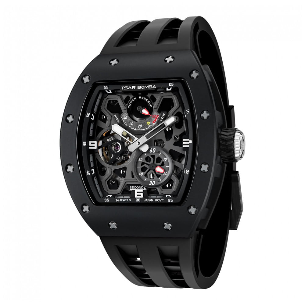 Atenção: Todos os produtos elétricos são 110V e necessitam de adaptador para a tomada no formato Brasileiro. Experimente a leveza e a inovação com o Relógio Mecânico Automático TSAR BOMBA 8212, equipado com uma estrutura ultraleve em fibra de carbono dupla face. Seu design interno exclusivo e inovador demonstra a excelência da marca ao utilizar materiais avançados para garantir alta resistência e durabilidade. O relógio possui um movimento esqueleto com 24 rubis que minimizam o desgaste das peças, prolongando significativamente a vida útil do produto. Destaque para o exclusivo ponteiro indicador às 12 horas, que mostra a reserva de energia do relógio, permitindo que você visualize facilmente a carga restante. O mecanismo utiliza o movimento japonês YN88, assegurando precisão na marcação do tempo. A pulseira é feita de FKM, um material superior à borracha de silicone, sendo resistente ao suor, umidade, desgaste e desbotamento, além de não causar reações alérgicas. O vidro de safira é altamente resistente a riscos e reflete a luz de maneira eficiente, conferindo sofisticação e proteção ao mostrador. Com função luminosa de alta qualidade nas ponteiras, você poderá ler as horas mesmo no escuro. Resistente à água até 5ATM, o relógio suporta contato com água fria, chuva e até natação de curta duração, adaptando-se perfeitamente ao seu dia a dia. Seu design tonneau (formato barril) se ajusta confortavelmente ao pulso, garantindo um visual elegante e versátil, ideal para ocasiões formais, eventos sociais ou uso cotidiano. A cor preta da pulseira e o mostrador grande complementam seu estilo moderno e imponente. Operação do relógio: a coroa possui duas posições - a primeira permite dar corda ao relógio com 20 a 30 voltas recomendadas para o primeiro uso, evitando sobrecarga; a segunda posição é para ajustar o horário. Quando o indicador de energia está no lado esquerdo, o relógio está totalmente carregado. O TSAR BOMBA 8212 é a escolha perfeita para quem busca um relógio mecânico confiável, durável e com design inovador, que alia tecnologia e estilo em um só produto. Especificações: Dimensões do Produto: 27 x 4,34 x 1,35 cm; 260 gramas, Modelo do Item: LZ-TSAR BOMBA-8212, Setor: Masculino, Fabricante: TSAR BOMBA, Largura do Item: 43,5 milímetros, Tipo de Fecho: Fivela, Tipo de Item: Relógio