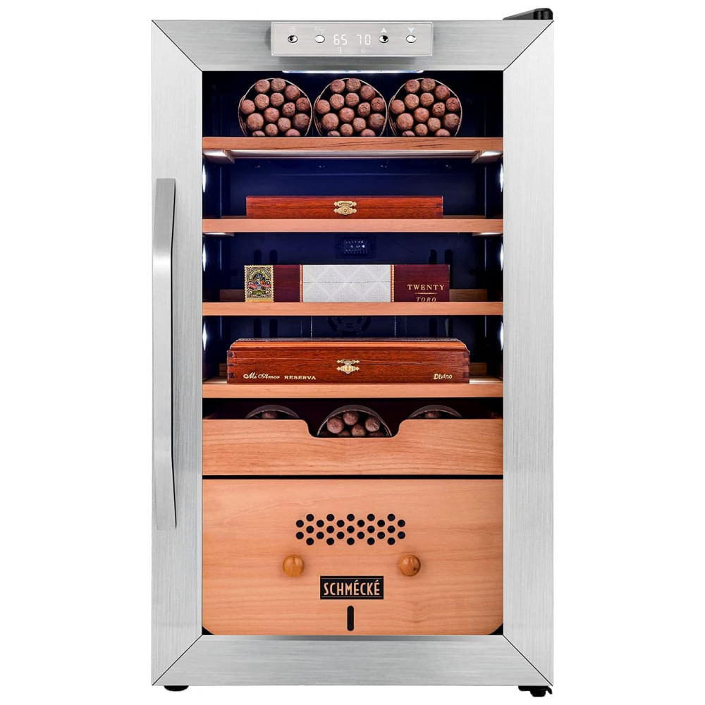 IMPONENTE AÇO INOXIDÁVEL E MADEIRA DE CEDRO O refrigerador de zenamento de charutos apresenta uma linda porta de vidro colorido de painel duplo, alça rebaixada elegante, acabamento em aço inoxidável, iluminação interna agradável, gaveta deslizante e prateleiras de madeira ajustáveis e removíveis, que são convenientes para organizar estoques de diversos estilos e tamanhos. Seu design autônomo e estabilização de temperatura permitem o uso tanto interno quanto externo