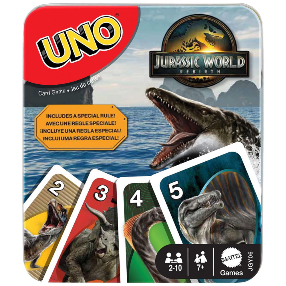 Atenção: Todos os produtos elétricos são 110V e necessitam de adaptador para a tomada no formato Brasileiro. UNO Jurassic World Rebirth é uma edição temática do clássico jogo de cartas UNO, com ilustrações inspiradas em personagens e cenas do filme Jurassic World Rebirth. A mecânica principal permanece a mesma: os jogadores precisam combinar cores e números para descartar as cartas da mão até ficarem sem nenhuma.? Esta versão inclui a regra especial “Attack of the T. Rex”, na qual um jogador escolhe uma cor e os demais devem baixar uma carta dessa cor ou comprar 5 cartas do monte, aumentando a intensidade da partida. O baralho vem acondicionado em uma lata colecionável decorativa, que facilita o armazenamento e exibição do jogo após o uso.? O conjunto é recomendado para 2 a 10 jogadores a partir de 7 anos, sendo adequado para sessões de jogo em família ou entre amigos. O conteúdo inclui 112 cartas padrão UNO, 1 carta foil colecionável e instruções de jogo.? Ficha Técnica: Marca: Mattel Games? Fabricante: Mattel? Linha/Franquia: UNO Jurassic World Rebirth? Modelo/ASIN: B0DC15YTVM? Tipo de produto: Jogo de cartas com regra especial temática? Tema: Humor e filme Jurassic World Rebirth? Idade recomendada: A partir de 7 anos? Número de jogadores: 2 a 10? Material das cartas: Papel cartão? Cor predominante: Multicolorido? Dimensões aproximadas da lata (C x L x A): 9,4 cm x 2 cm x 14,5 cm? Peso do produto: 0,14 kg? Peso do pacote (produto + embalagem): 0,18 kg? Regras especiais: Carta “Attack of the T. Rex” com compra de 5 cartas em caso de falha de combinação? Número de cartas: 112 cartas de jogo + 1 carta foil colecionável? Unidade de venda: 1 lata colecionável com baralho UNO Jurassic World Rebirth? Conteúdo da embalagem: 112 cartas UNO, 1 carta foil, lata colecionável e instruções? Manual do usuário: Inglês?