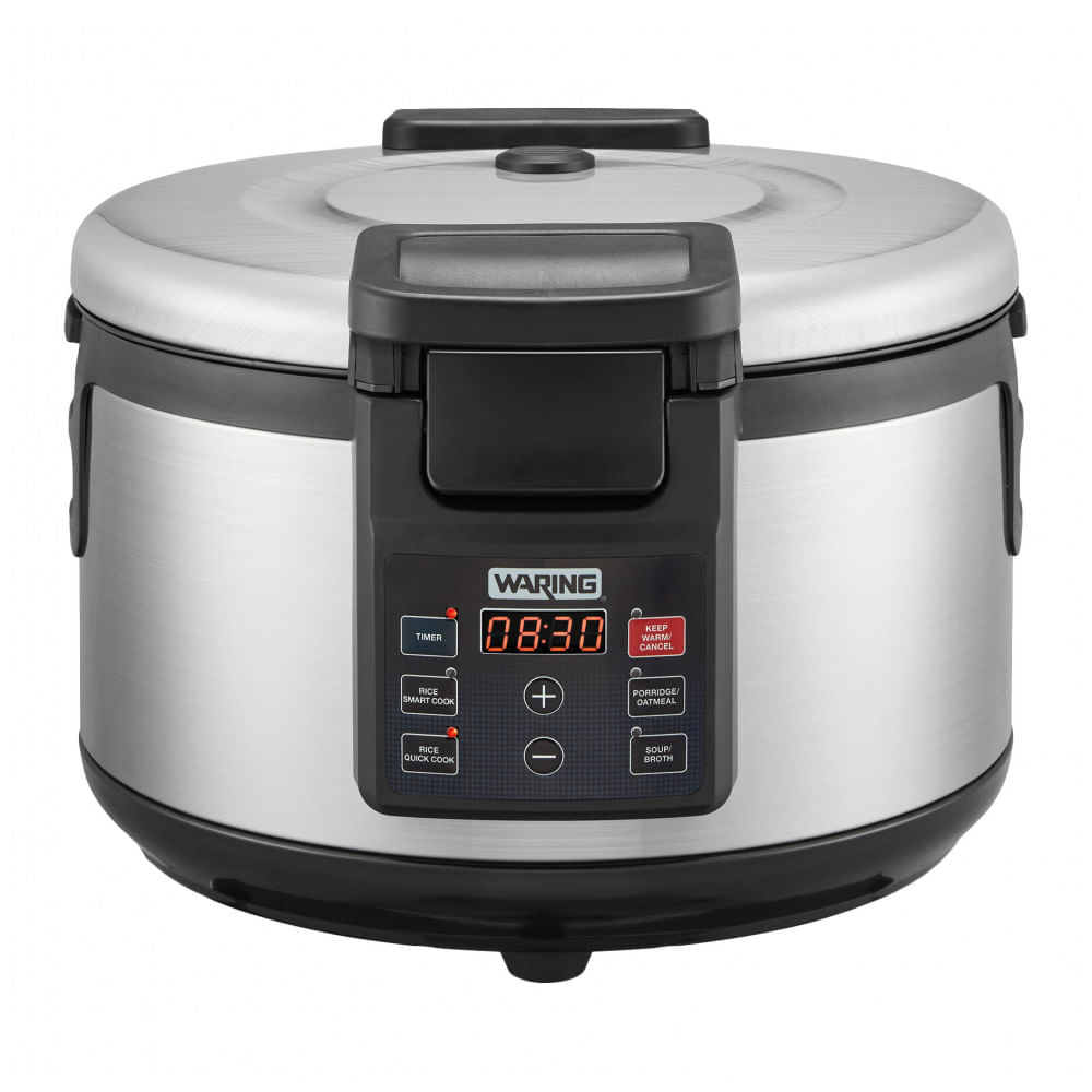 Atenção: Todos os produtos elétricos são 110V e necessitam de adaptador para a tomada no formato Brasileiro. O cozedor de arroz elétrico Waring WRC60, com capacidade de 60 xícaras cozidas (30 xícaras cruas), prepara arroz branco, integral ou jasmine, além de aveia, macarrão e sopas em cozinhas profissionais. Funções inteligente (com umedecimento inicial) e rápida (sem umedecimento) ativam aquecimento automático de espera por até 8 horas após cocção, com timer regressivo e controles touch digitais. Construção de dupla parede isolada em aço inoxidável escovado, com pote interno antiaderente sem PFAS e revestimento cerâmico removível por alças. Tampa articulable garante cozimento uniforme; copo de umidade coleta vapor para reduzir respingos. Pés de borracha antiderrapantes estabilizam em bancadas. Inclui espátula de arroz, copo medidor e tapete de silicone antiaderente. Compatível com conexão elétrica 110 V, 60 Hz, 15 A, cabo de 1,22 m e plugue NEMA 5-15P. Limpeza facilitada pelo pote removível. Ficha Técnica • Dimensões do produto (fechado): 54,6 cm (L) x 43,8 cm (P) x 32,4 cm (A)? • Dimensões aberto: 79,9 cm (A)? • Peso do produto: 16,75 kg? • Peso com embalagem: 18 kg (envio)? • Potência: 1800 W? • Corrente: 15 A? • Voltagem: 110 V? • Frequência: 60 Hz? • Fase: 1? • Capacidade cozida: 60 xícaras de arroz? • Capacidade crua: 30 xícaras de arroz? • Materiais: aço inoxidável (corpo isolado duplo); cerâmico sem PFAS (pote interno antiaderente)? • Comprimento do cabo: 1,22 m (4 pés)? • Fonte de alimentação: elétrica, plugue NEMA 5-15P? • Acessórios: espátula de arroz, copo medidor, tapete de silicone antiaderente, copo de umidade? • Faixa etária: uso profissional (adultos)? • Conteúdo da caixa: 1 cozedor WRC60, espátula, copo medidor, tapete silicone? • Manual do usuário: inglês