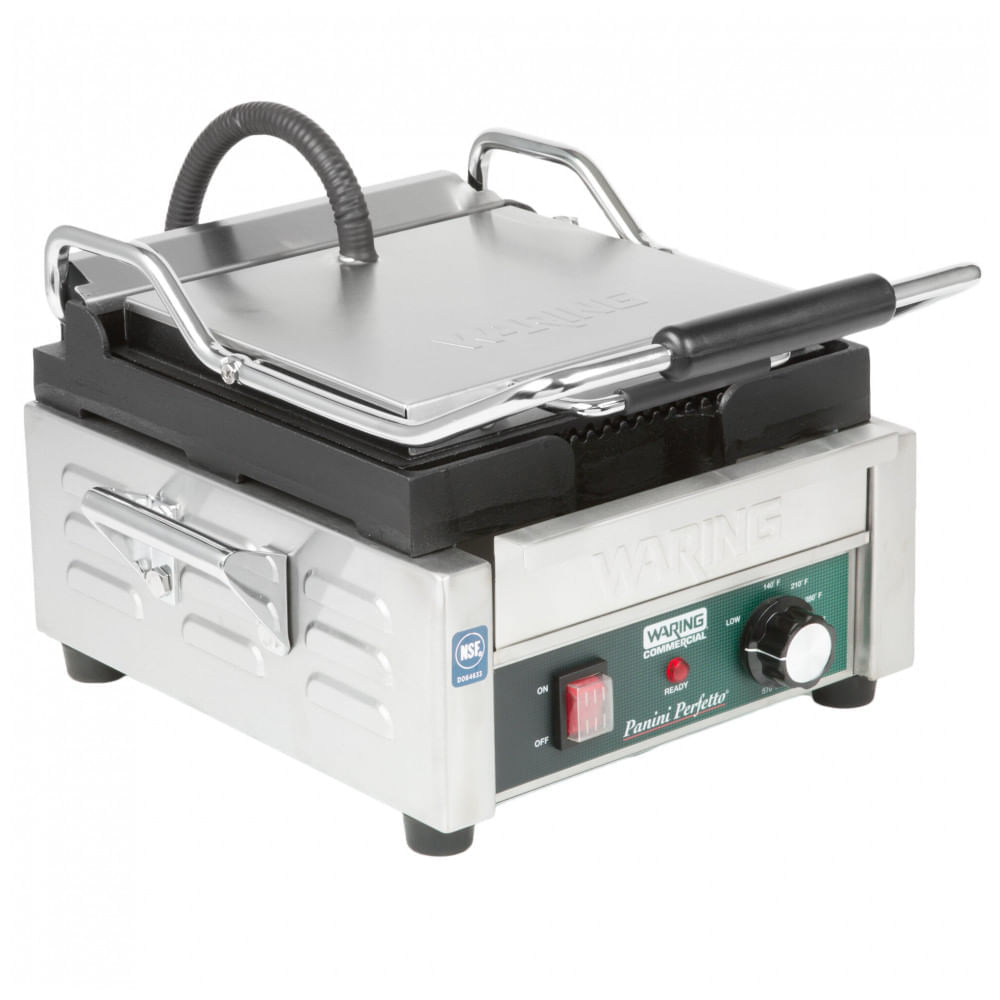 Atenção: Todos os produtos elétricos são 110V e necessitam de adaptador para a tomada no formato Brasileiro. A Waring WPG150 é uma grelha panini profissional com placas sulcadas topo e base, superfície de cozimento de 24,8 x 23,5 cm e capacidade para alimentos até 7,6 cm de espessura. Com potência de 1800W e controle por dial até 299°C, processa sanduíches panini, bagels, hambúrgueres e burritos em cozinhas de médio volume. Placas de ferro fundido criam marcas de grelha características com derretimento uniforme. Construção em aço inoxidável escovado resiste a uso contínuo em ambientes comerciais. Placa superior articulada aplica pressão consistente. Luzes indicadoras sinalizam pré-aquecimento e temperatura operacional. Compatível com alimentação monofásica de 60 Hz. Certificada NSF para padrões de higiene em equipamentos de cozinha. Cuidados incluem limpeza das placas após resfriamento com pano úmido e detergente neutro, evitando materiais abrasivos. Verificar conexões elétricas periodicamente. Ficha Técnica • Dimensões do produto: Largura 39,4 cm; Profundidade 29,2 cm; Altura 23,5 cm.? • Superfície de cozimento: Largura 24,8 cm; Profundidade 23,5 cm.? • Peso do produto: 22,7 kg.? • Peso com embalagem: 24 kg.? • Potência: 1800 W.? • Tensão: 110 V.? • Corrente: 15 A.? • Frequência: 60 Hz.? • Fase: 1.? • Temperatura máxima: 299°C.? • Controle: Dial mecânico.? • Materiais: Corpo em aço inoxidável; Placas de ferro fundido sulcadas (topo e base).? • Recursos: Placa superior articulada, luzes indicadoras, certificada NSF.? • Uso: Médio duty.? • Faixa etária: Uso profissional adulto.? • Conteúdo da caixa: 1 grelha panini.? • Manual do usuário: Inglês.
