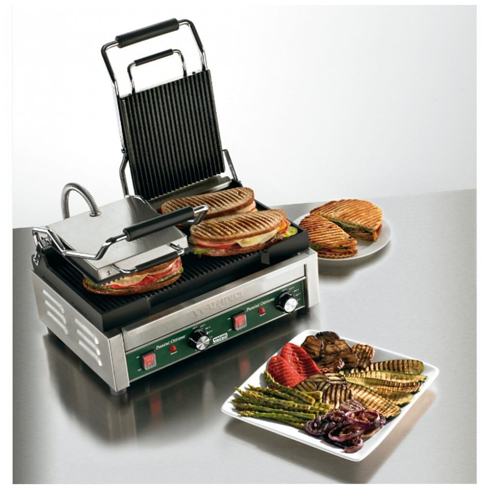 Atenção: Todos os produtos elétricos são 110V e necessitam de adaptador para a tomada no formato Brasileiro. A Waring WPG300T é uma prensa panini elétrica dupla com placas raiadas superior e inferior em ferro fundido, superfície de cozimento de 43 cm x 23,5 cm e timers independentes. Projetada para grelhar sanduíches panini, bagels, burgers e burritos de até 7,6 cm de espessura em cozinhas de médio porte com alto volume. Estrutura em aço inoxidável para resistência em uso comercial. Placas de ferro fundido retêm calor para marcação raiada. Controles por dial com temperatura máxima de 299°C e timers para precisão temporal em cada placa. Indicadores de status operacional. Compatível com rede 240V, 60Hz, 1 fase, consumindo 3120W e 13A. Certificação NSF para higiene profissional. Cuidados: Limpar placas após resfriamento com espátula plástica e pano úmido; evitar detergentes abrasivos ou imersão. Ficha Técnica • Largura total: 47,6 cm? • Profundidade: 39,4 cm? • Altura: 23,5 cm? • Superfície de cozimento: 43 cm (largura) x 23,5 cm (profundidade)? • Peso do produto: 32,6 kg? • Peso com embalagem: 35,6 kg? • Potência: 3120 W? • Tensão: 240 V? • Corrente: 13 A? • Frequência: 60 Hz? • Fase: 1? • Temperatura máxima: 299°C? • Controles: Dial com timers? • Configuração das placas: Raiadas superior e inferior? • Material das placas: Ferro fundido? • Fonte de alimentação: Elétrica? • Tamanho: Dupla, médio duty? • Certificações: NSF? • Conteúdo da caixa: 1 prensa panini WPG300T? • Manual do usuário: Inglês