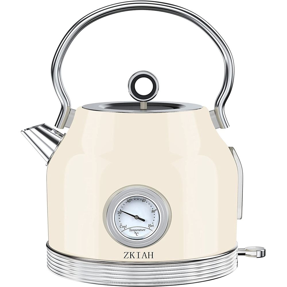 DESIGN AMIGÁVEL O indicador de nível de água pode medir o nível de água. O termômetro pode controlar a temperatura da água. O interruptor indicador LED pode fornecer feedback visual quando a água é fervida. O cabo curvo é ergonômico e ante escaldante. A chaleira pode ser retirada da base giratória de 360 , este design sem fio permite que a chaleira seja levada para onde for necessária água quente e também torna mais fácil deitar água. Tampa e filtro de bico separados podem tornar a limpeza mais conveniente.